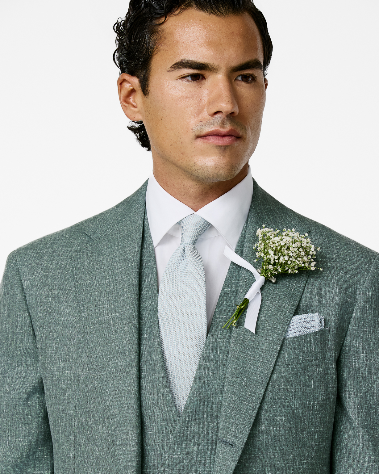 A standout look for a summer wedding or special event, this dark sage three-piece suit blends unmistakable character and effortless elegance. The garment is crafted from Summertime® fabric made in Italy by Loro Piana. The flawless tropical weave of wool, silk, and linen offers a luxuriously comfortable garment with lightness and breathability. Designed here as a 2.5-button jacket with notch lapels and an unconstructed camicia shoulder. Style it for your special day with a textured turquoise tie, matching pocket square and polished tassel loafers.