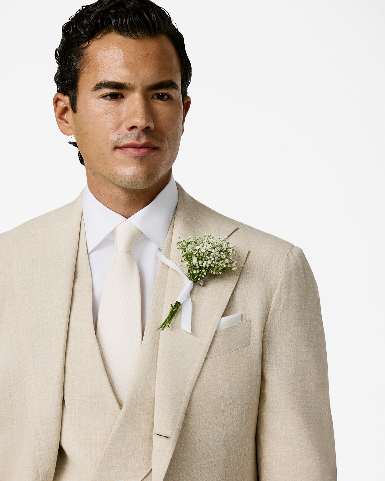 For those in search of elegant appeal with a summer touch, look no further than this ecru three-piece suit. The garment is crafted from Summertime® fabric made in Italy by Loro Piana. The flawless tropical weave of mélange wool, silk, and linen offers a luxuriously comfortable garment with lightness and breathability. Designed here as a 2.5-button jacket with notch lapels and an unconstructed camicia shoulder. Style it for your special day with a white shirt, silk tie, and suede loafers.