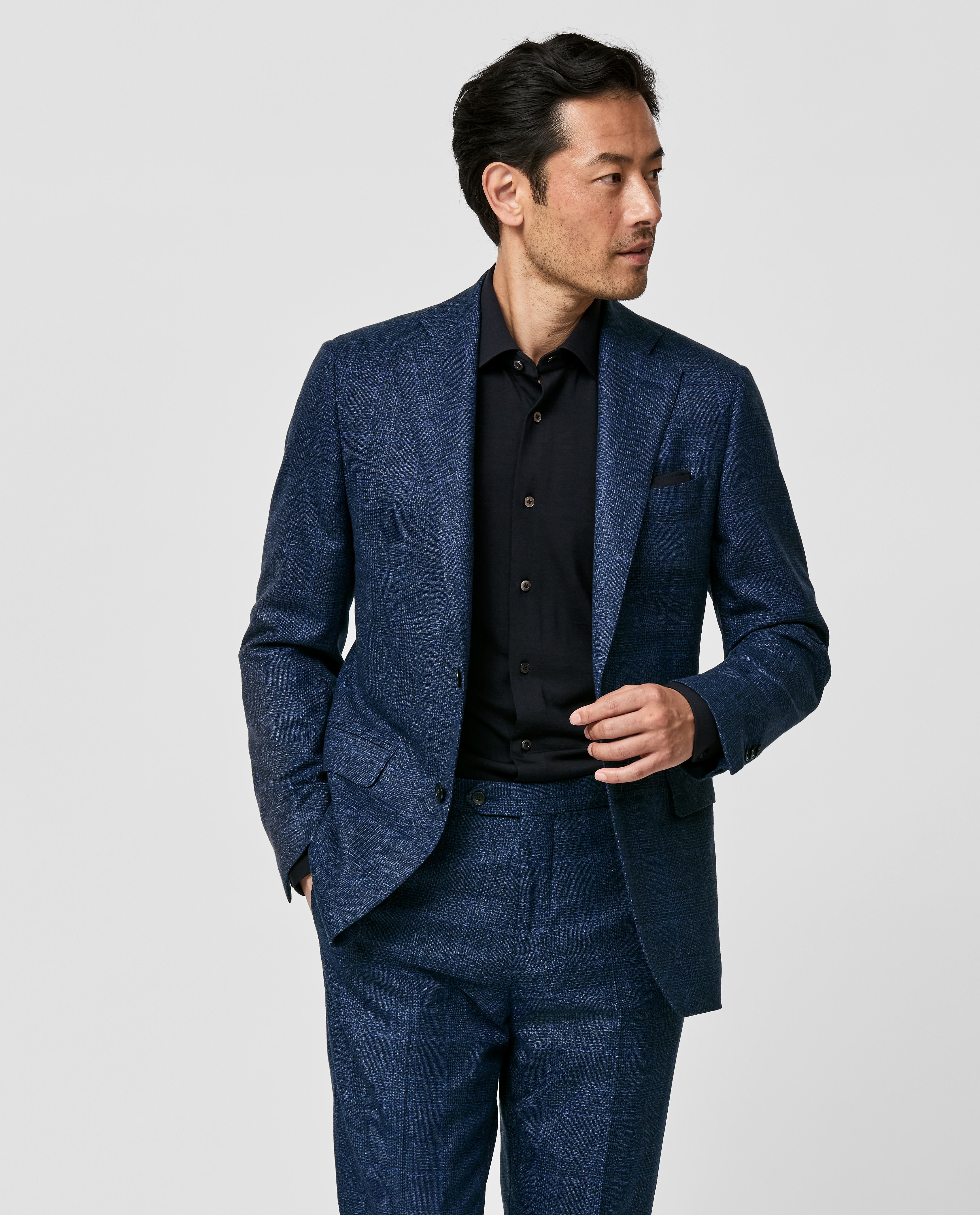 A traditional pattern in a modern palette, this Neapolitan blue suit is a comfortable classic. Crafted from Zelander® Natural Stretch fabric made in Italy by Loro Piana. The breathable S120 wool with natural stretch is crafted with carded yarns for a winter vibe. Style it with a tonal jersey shirt and suede shoes to complete the look. Make this suit your own with our many customization options to choose from. S120 wool Glen plaid Natural stretch Breathable