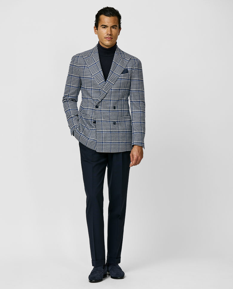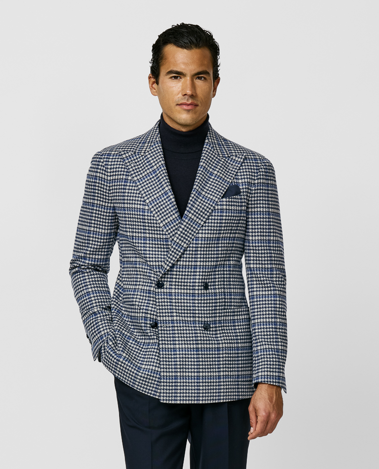 This navy and sand houndstooth windowpane jacket is the ultimate in luxury and comfort. Crafted from Cashmere Wish® fabric made in Italy by Loro Piana. The breathable blend combines S170 merino wool and cashmere to create an extremely soft and drapable fabric that will envelop you with warmth. Style it with a knit, woolen trousers, and suede loafers to complete the look. Make this jacket your own with our many customization options to choose from. Merino wool & cashmere Houndstooth Warm Fluid drape Soft feel