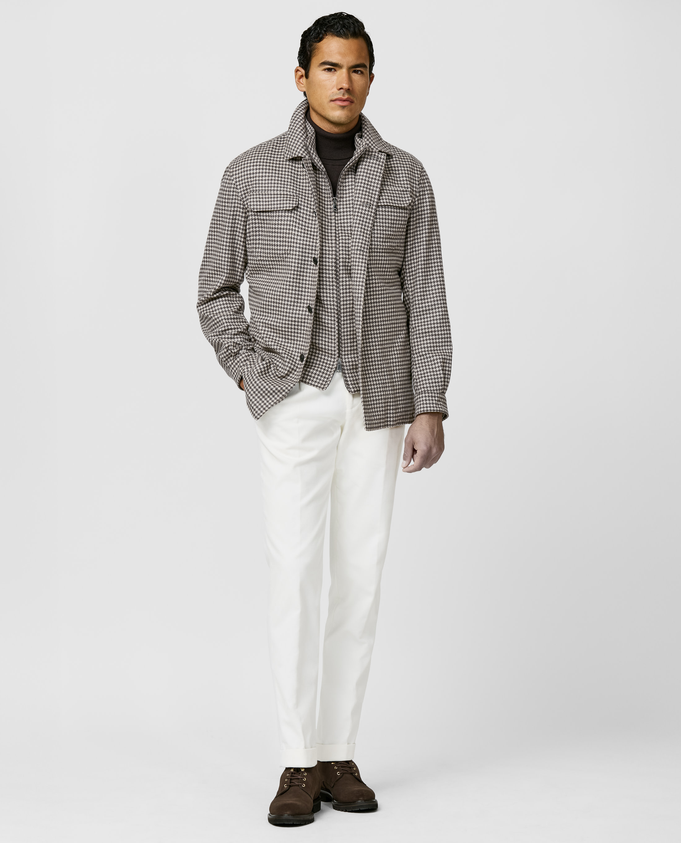 With a houndstooth softened in color and touch, this sand and coffee brown utility jacket is perfect to pair with your winter neutrals. Crafted in a cozy blend of wool and cashmere. Style it with a knit, 5-pocket pants, and suede runners to complete the look. Make this jacket your own with our many customization options to choose from.