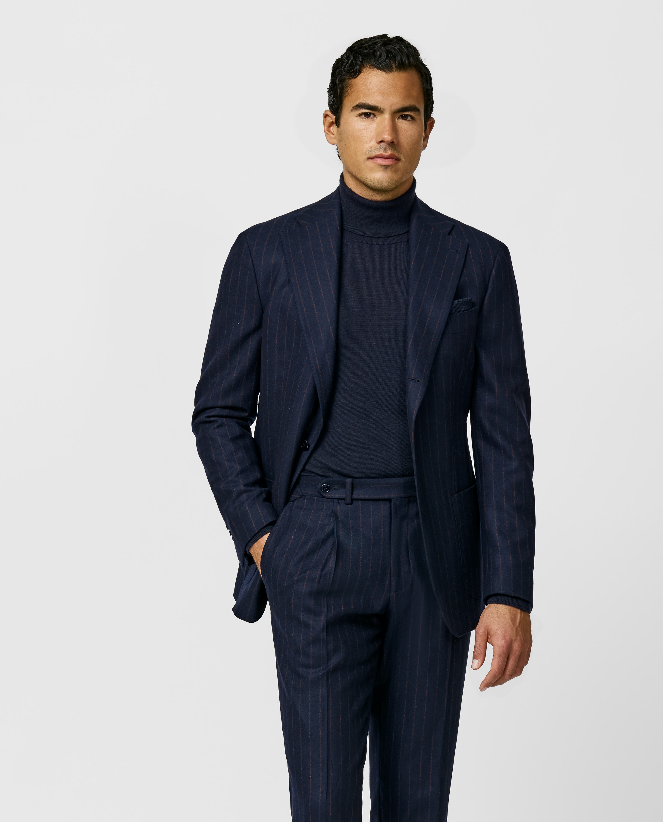 This dark indigo suit with rust stripes in stretch wool introduces a new level of flexibility, blending performance, comfort, and impeccable style. Designed to move with the body, this innovative fabric is woven on a shuttle loom, combining the soft, knitted effect of jersey with the resilience and refined finish of a classic woven quality. Complete the look with a cashmere-silk turtle neck, silk pocket square, and suede penny loafers. Make this suit your own with our many customization options to choose from. Stretch Stripe Breathable High Performance Comfort