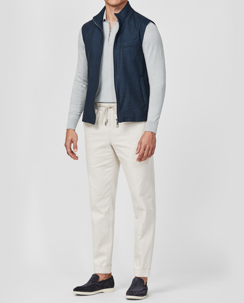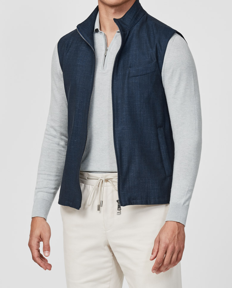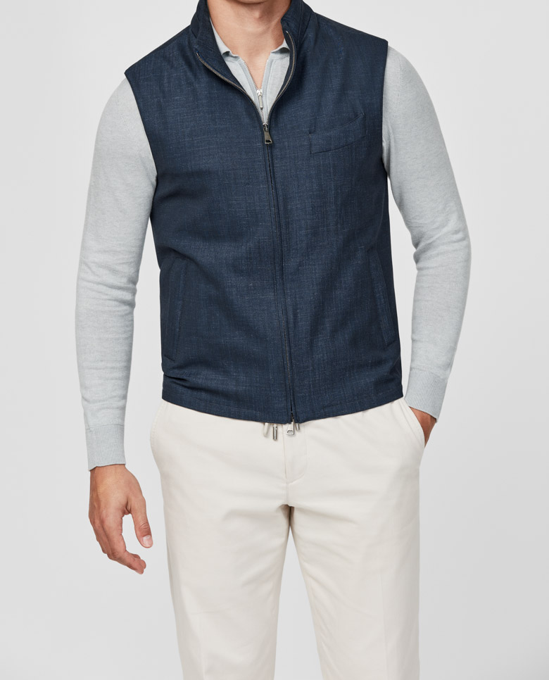 Add some welcome variety to your summer evenings with this indigo vest. With a sleek slim fit, its a light layer you can wear in all four seasons. Made from an open weave of wool, linen, and technical fibers by Loro Piana offering stretch for more comfort and freedom of movement. Designed here with a two-way zip closure. Pair it with a polo, drawstring trousers, and suede city loafers to complete the look. Make this vest your own with our many customization options to choose from.