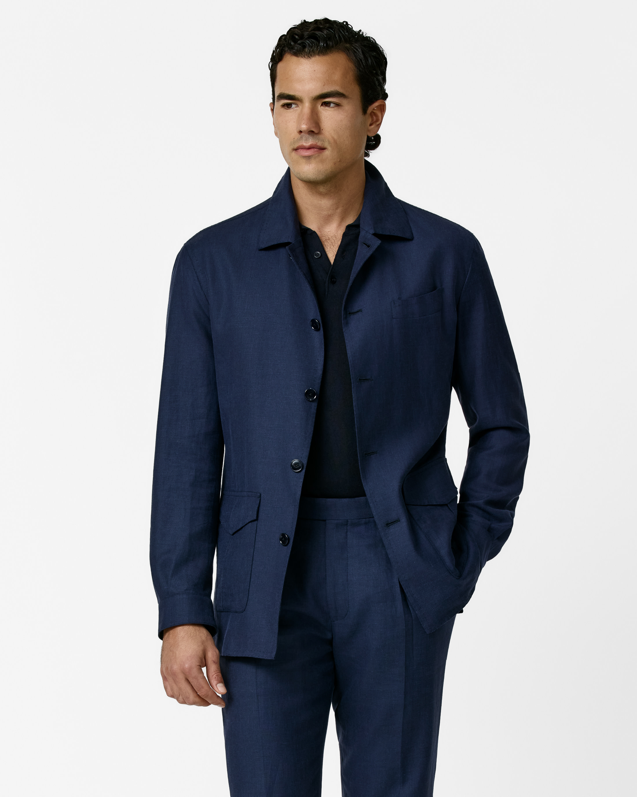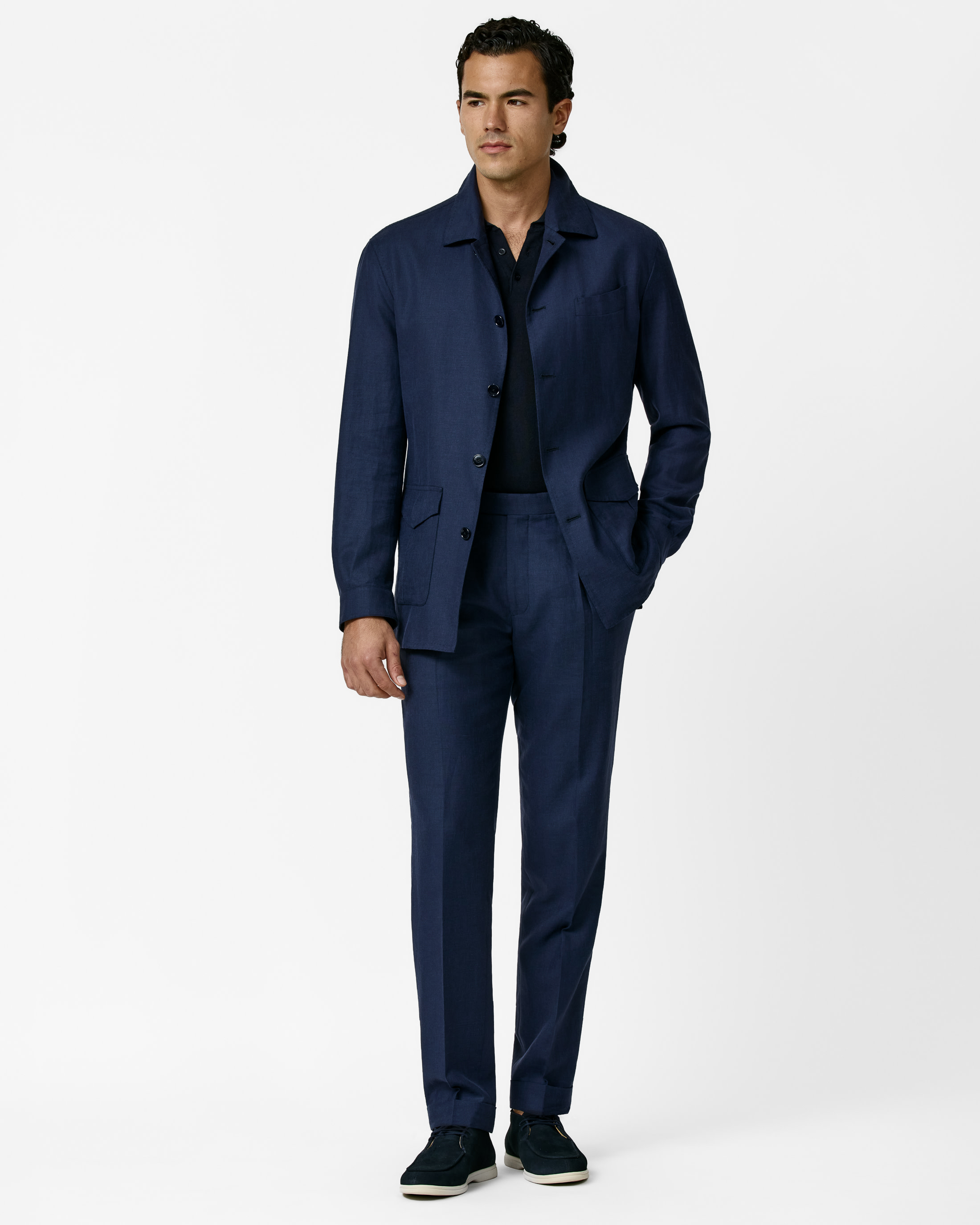 Featuring one of our favorite summer blends, this dark blue suit adapts to your body with ease. The garment is crafted from Linen Way® fabric made in Italy by Loro Piana. The sharkskin weave skilfully combines fine linen, precious wool and the highest quality silk to offer a two-way stretch without the addition of any technical fibers. Designed here as a lightweight utility jacket and pleated cuffs. Style it with a tonal polo knit and mid-top city loafers to complete the look.