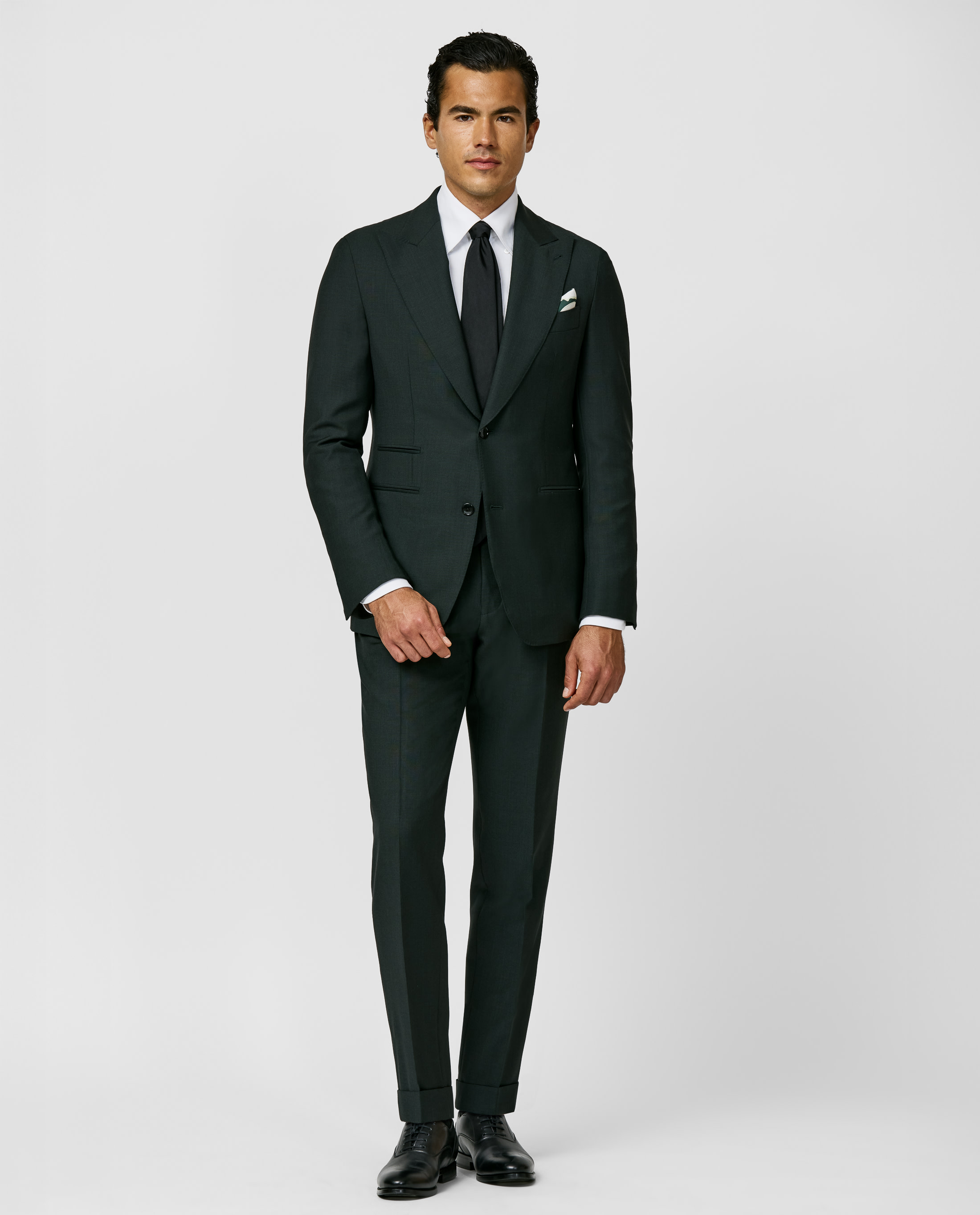 An unexpected but understated option for the office. Stay comfortable and crease free for those meetings in this forest green micro-effect suit. The firmly woven stretch wool by Loro Piana is both breathable and less prone to wrinkling. Style it with a white Oxford shirt and calfskin plain-tip shoes to complete the look. Make this suit your own with our many customization options to choose from. Wool blend Stretch Micro-effect Breathable Crease resistant