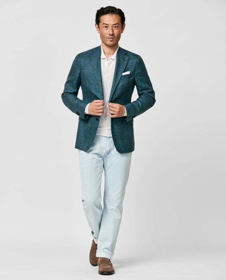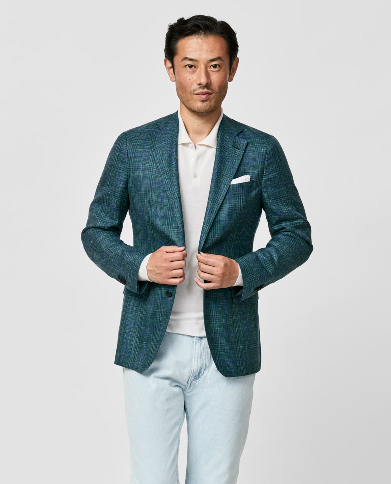 Crafted from luxurious Summertime® fabric made in Italy by Loro Piana, this green jacket with blue overchecks merges outstanding breathability with a subtle, elegant shine. Designed here with a classic 2-button closure, notch lapels, and straight flap side pockets. Pair it with a lightweight knit, jeans, and loafers to create a smart-casual seasonal look. Prefer a different style? Every piece is made exclusively for you, with your choice of design options. Wool, silk & linen Overcheck Breathable Subtle shine Lightweight