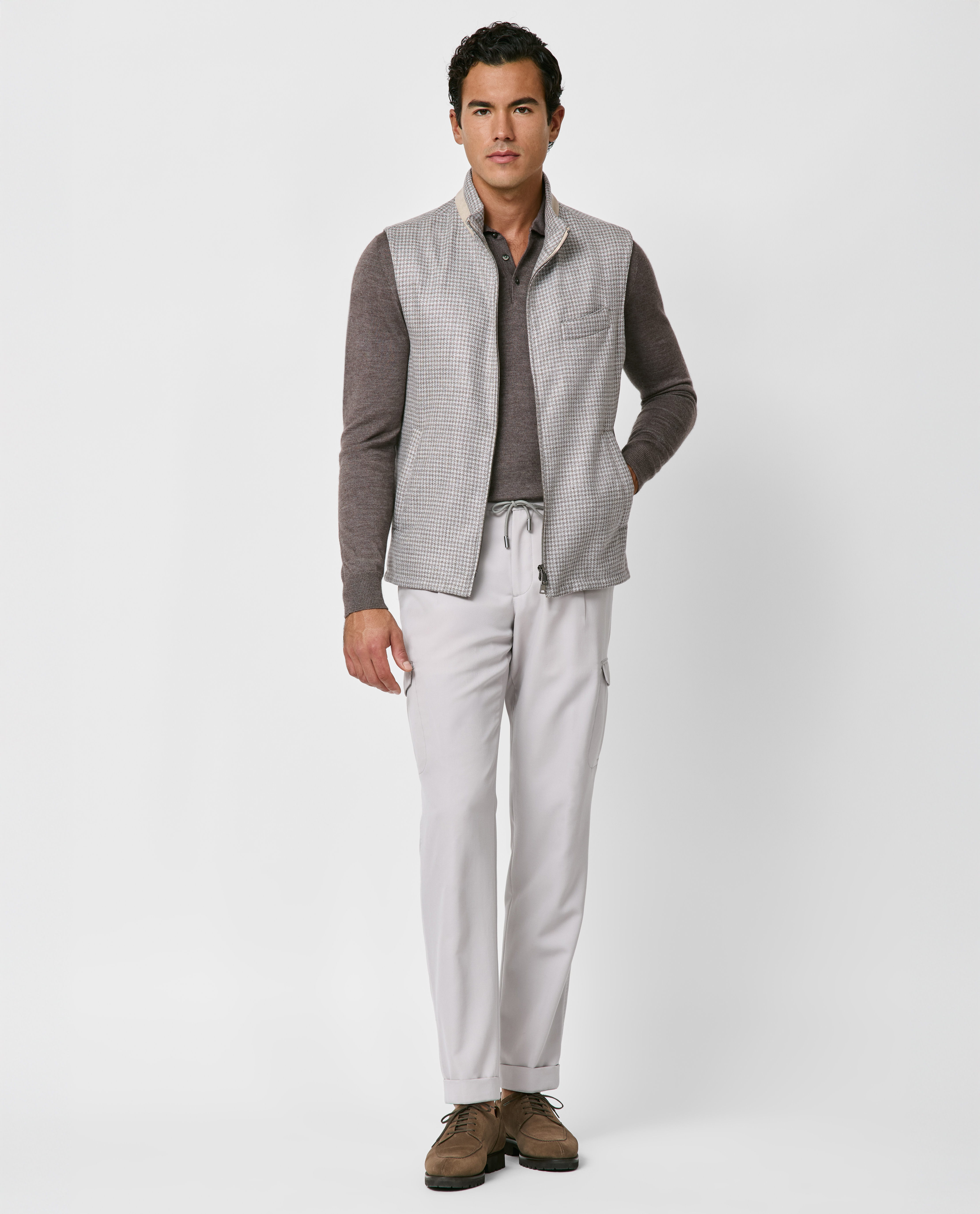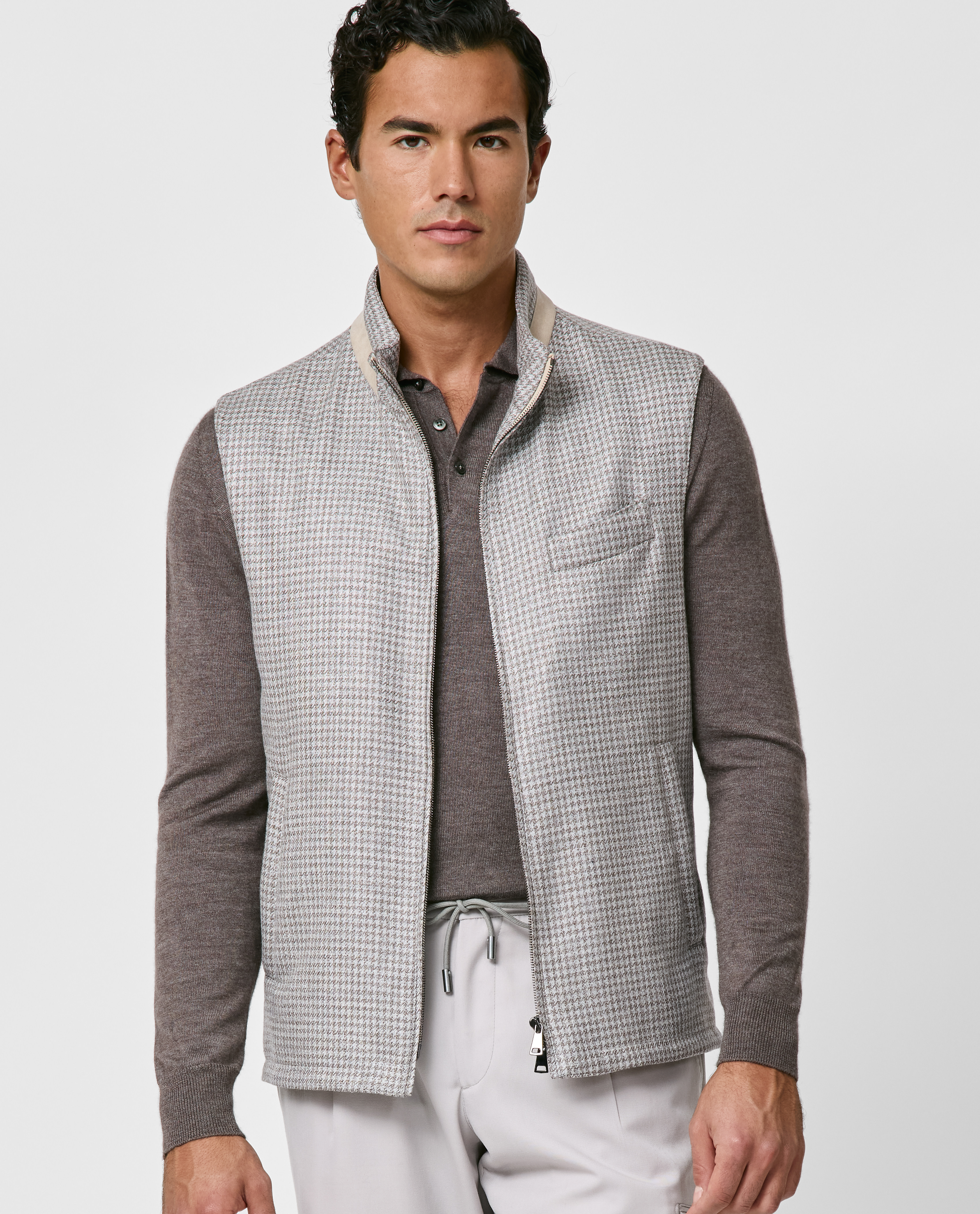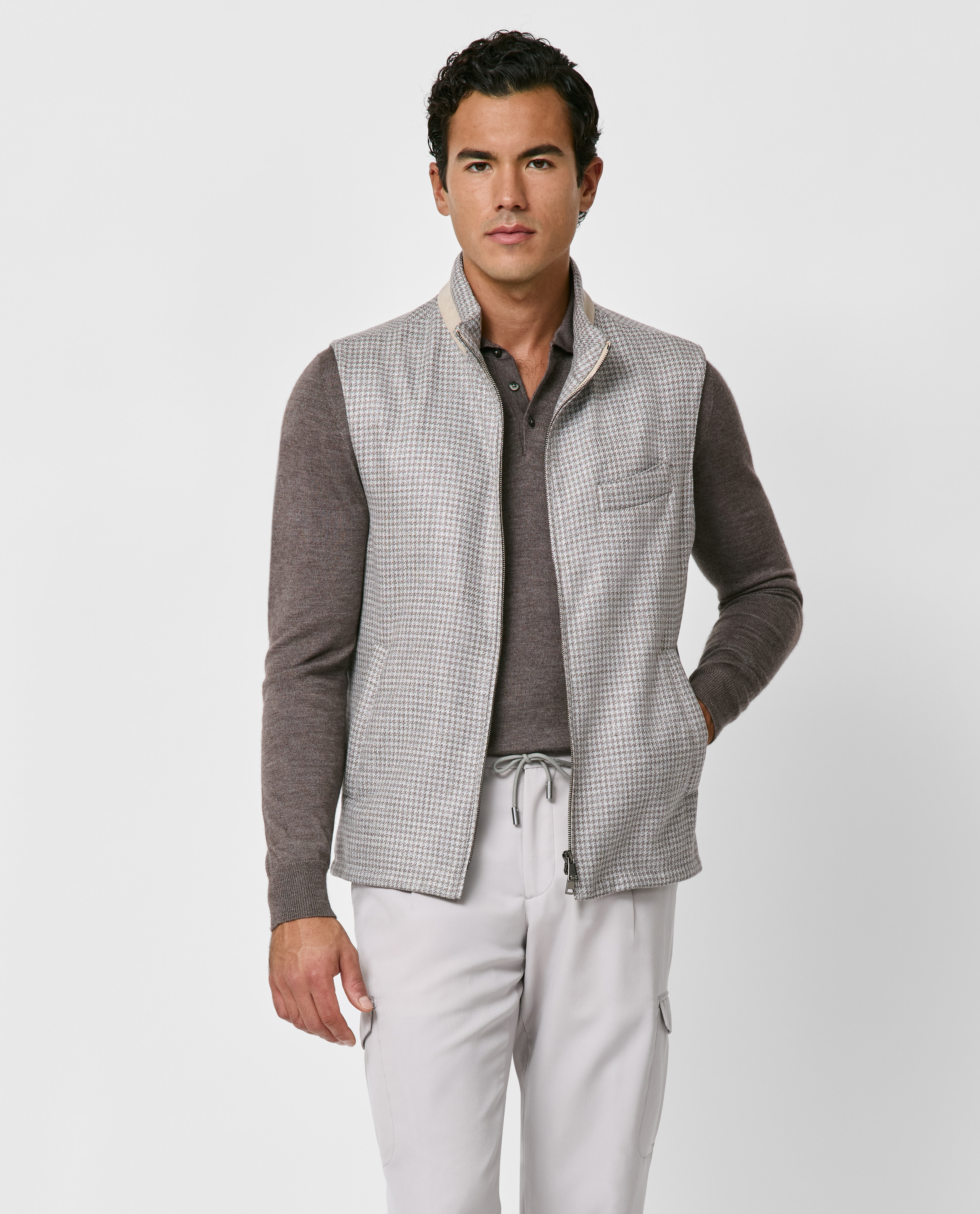 Crafted from luxurious Summertime® fabric made in Italy by Loro Piana, this light gray and taupe houndstooth vest combines outstanding breathability with a subtle, elegant shine. Designed here with a practical two-way zip closure and timeless rounded welt chest pocket. Pair it with a soft knit, drawstring trousers, and lightweight loafers to create a polished smart-casual look. Prefer a different style? Every piece is made exclusively for you, with your choice of design options. Wool, silk & linen Houndstooth weave Breathable Subtle shine Four-season weight