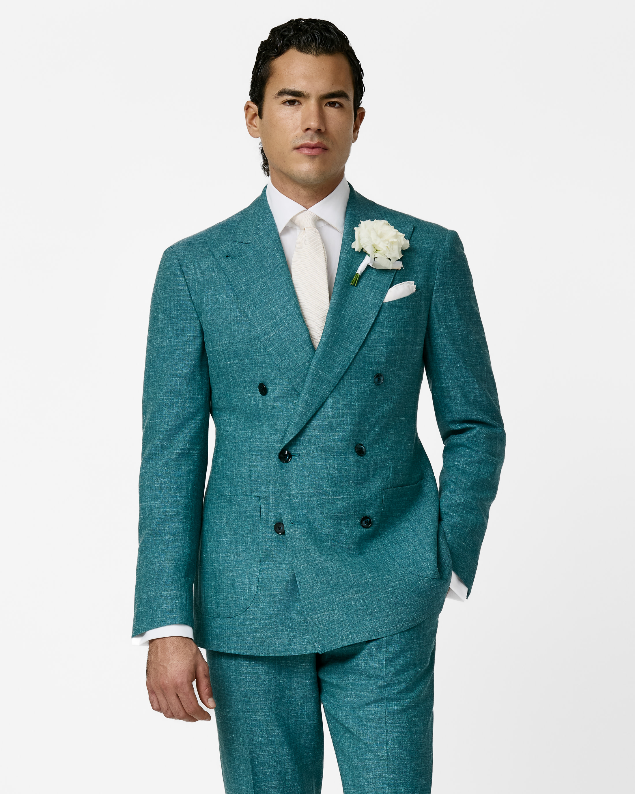 A standout look for a summer wedding or special event, this teal blue suit blends unmistakable character and effortless elegance. The garment is crafted from Summertime Move® fabric made in Italy by Loro Piana. The flawless tropical weave of wool, silk, and linen offers a luxuriously comfortable garment with lightness and breathability. Designed here as a double-breasted jacket with peak lapels and an unconstructed shoulder. Style it for your special day with a light-colored silk tie and pocket square with calfskin loafers.