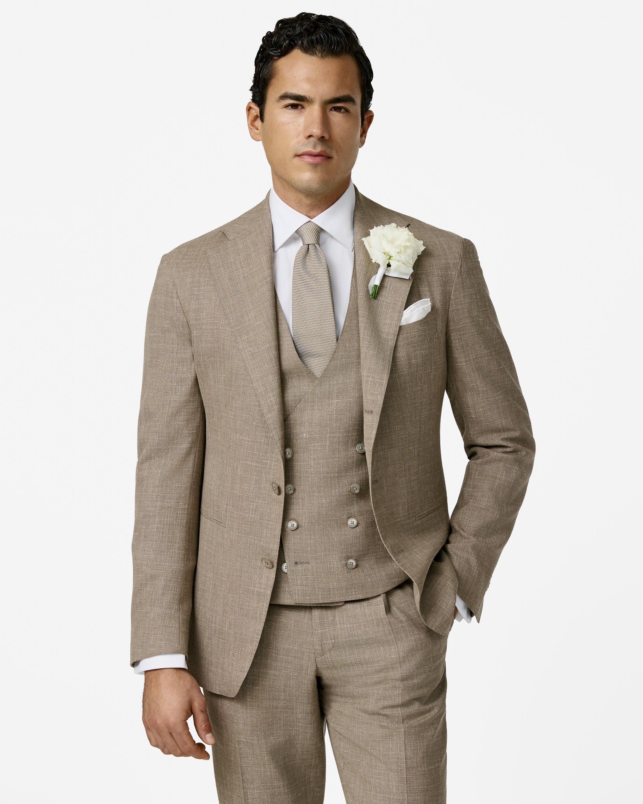For those in search of elegant appeal with a summer touch, look no further than this taupe three-piece suit. The garment is crafted from Summertime Move® fabric made in Italy by Loro Piana. The flawless tropical weave of mélange wool, silk, and linen offers a luxuriously comfortable garment with lightness and breathability. Designed here as a 2.5-button jacket with notch lapels and a matching waistcoat. Style it for your special day with a brown textured tie and polished tassel loafers.
