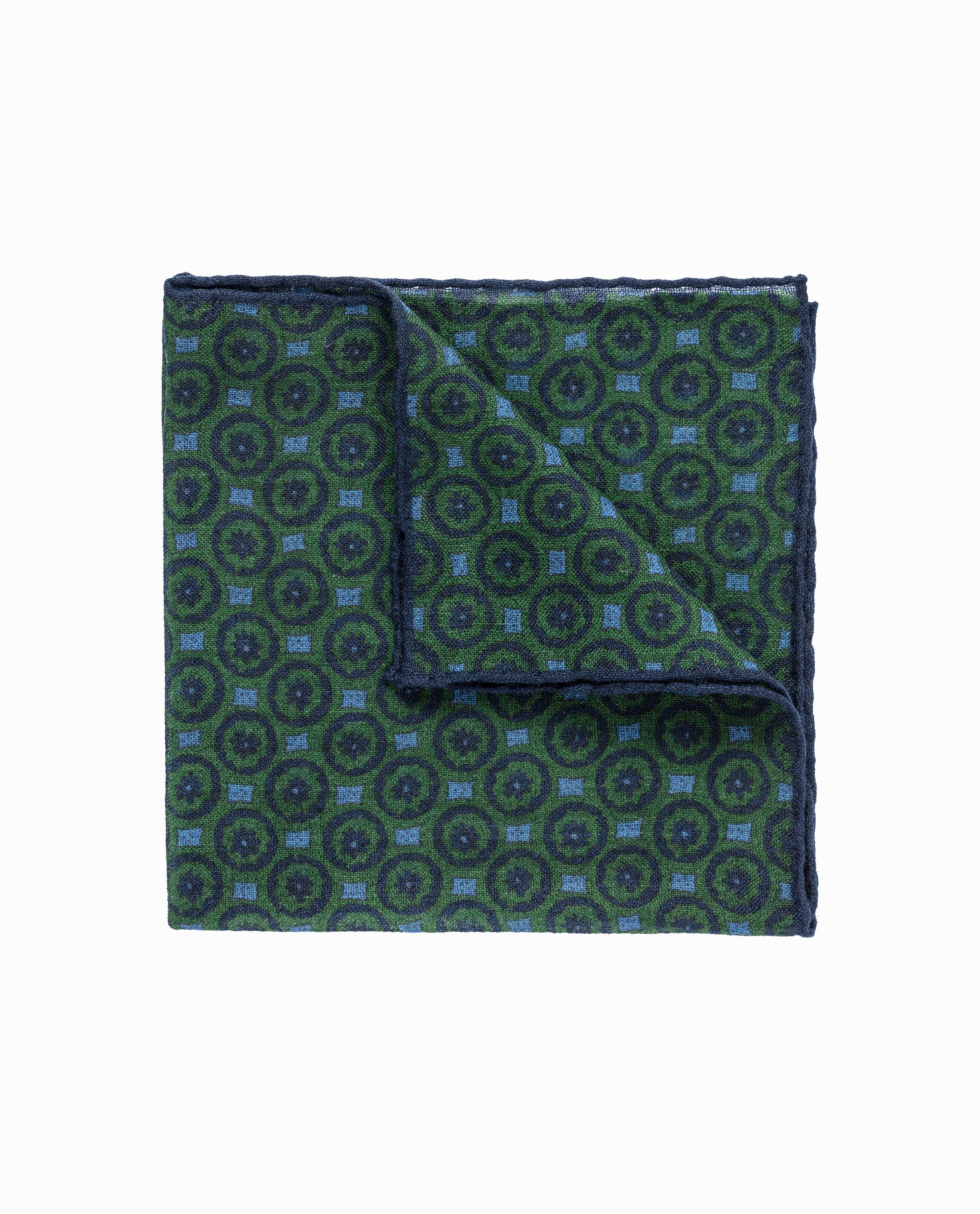 Soft and durable, this open-weave wool pocket square is a bold yet refined addition to your look. Here in bright evergreen with a modern tile print in mixed blues. Make this pocket square your own with a monogram.