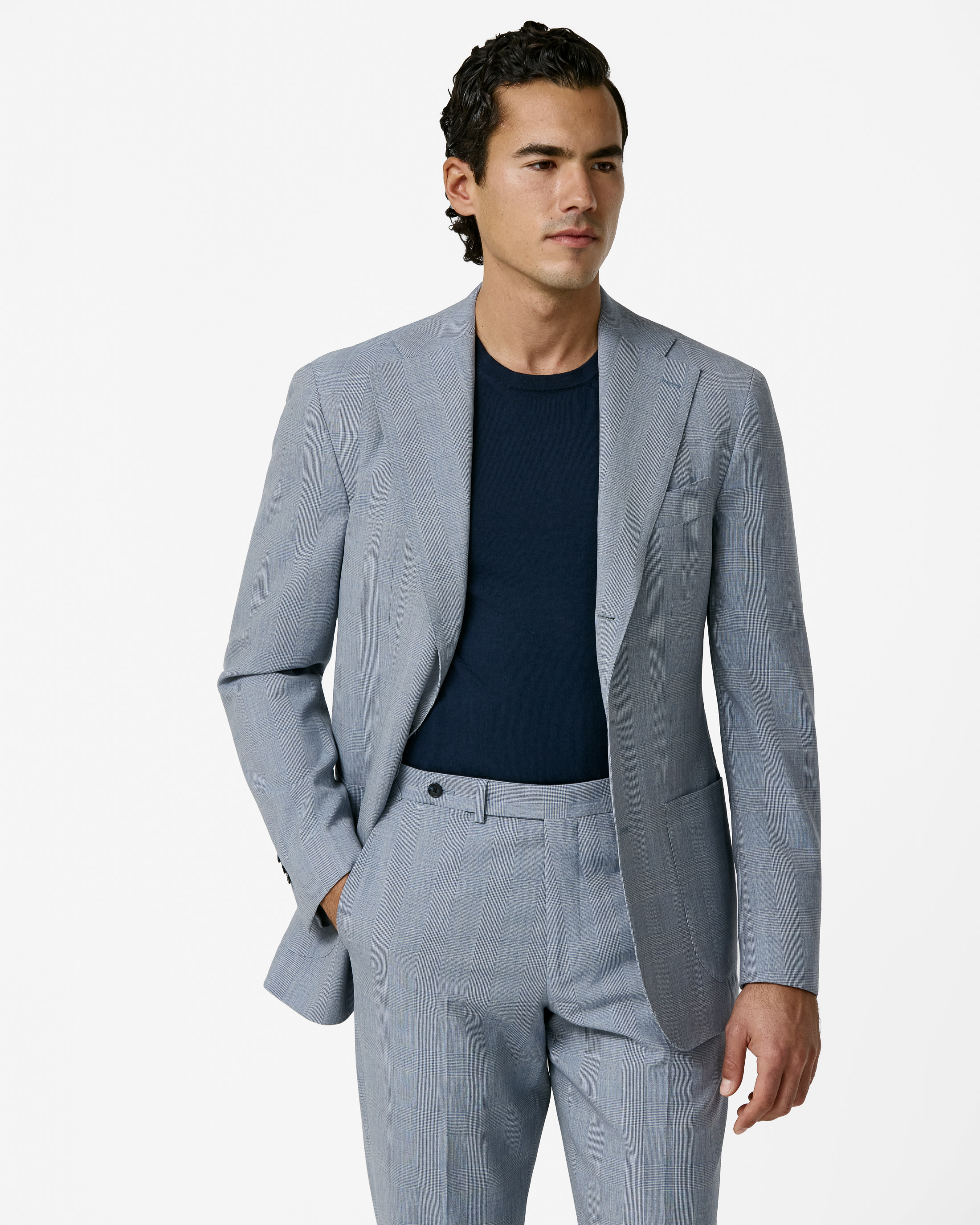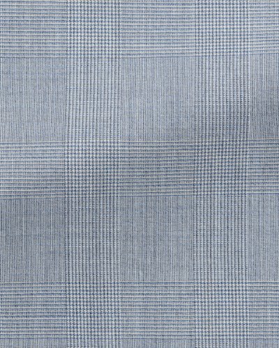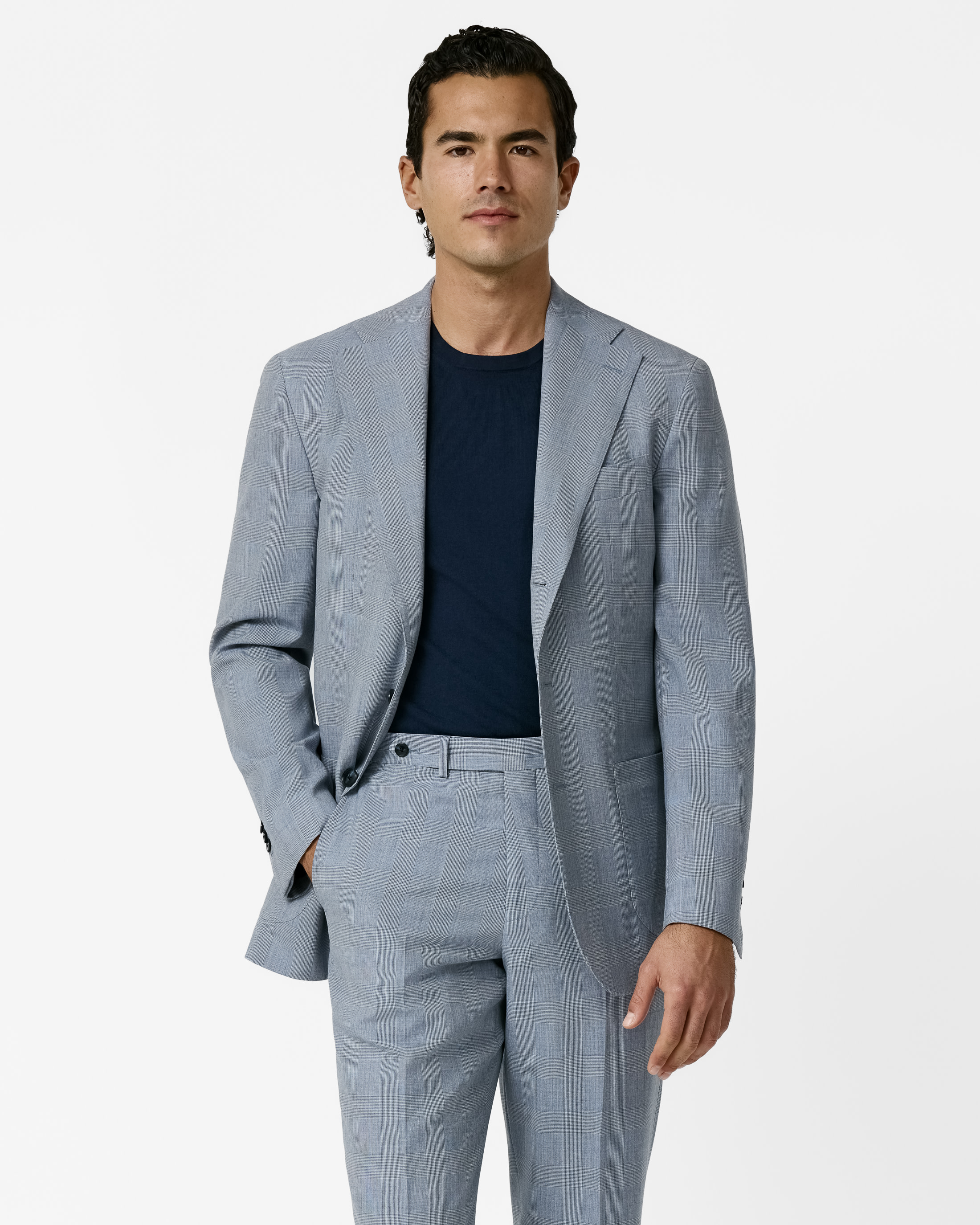 This soft blue suit with ivory glen plaid is tailored to spring and summer business and travel. Woven from pure wool with natural bi-stretch, it combines a clean cut look with excellent breathability, lightness, and comfort. A standout feature is its machine washability, bringing easy-care convenience to high-performance tailoring. Designed here as a 2.5-button jacket with notch lapels and an unconstructed shoulder. Style it with a navy t-shirt knit and suede loafers to complete the look.