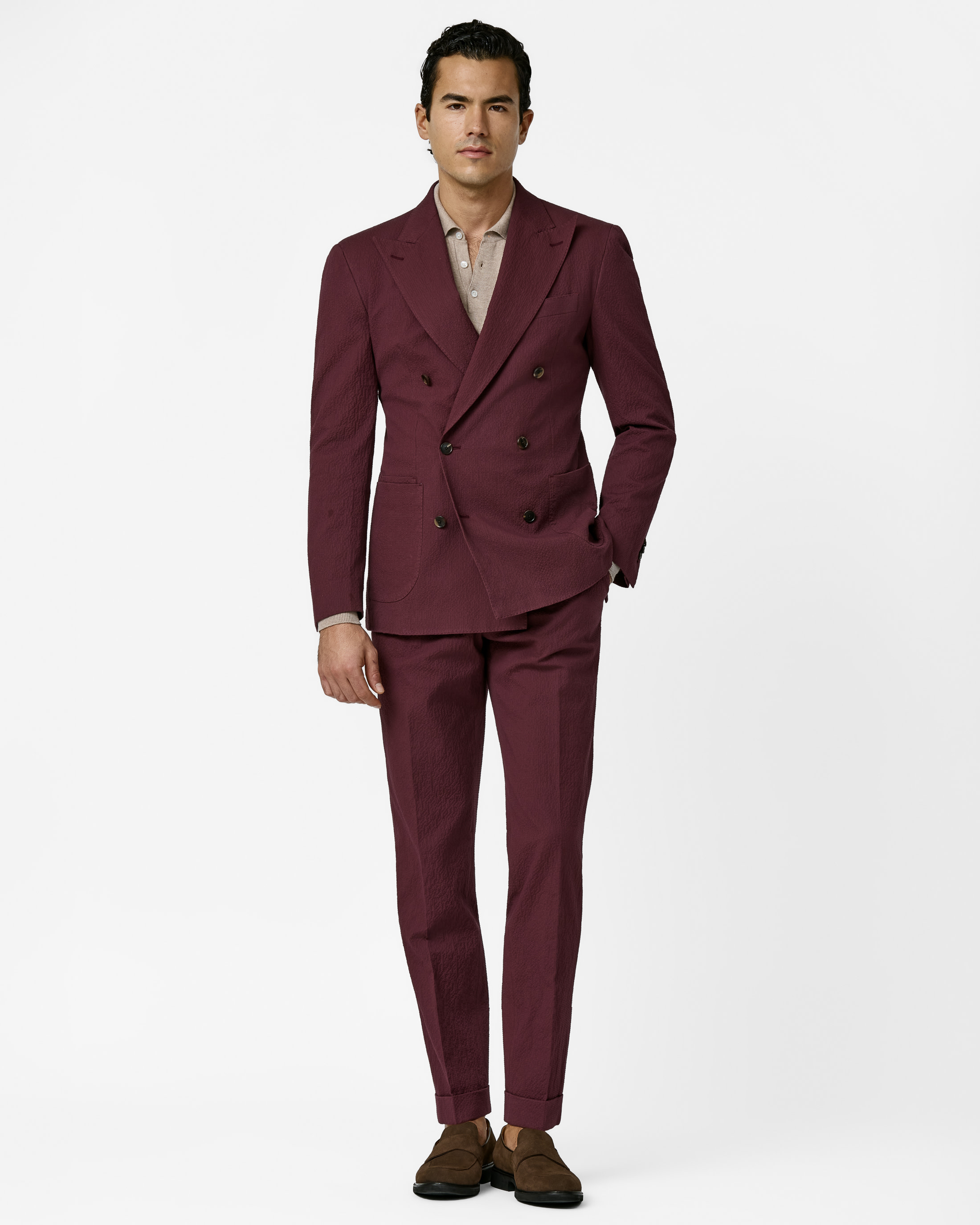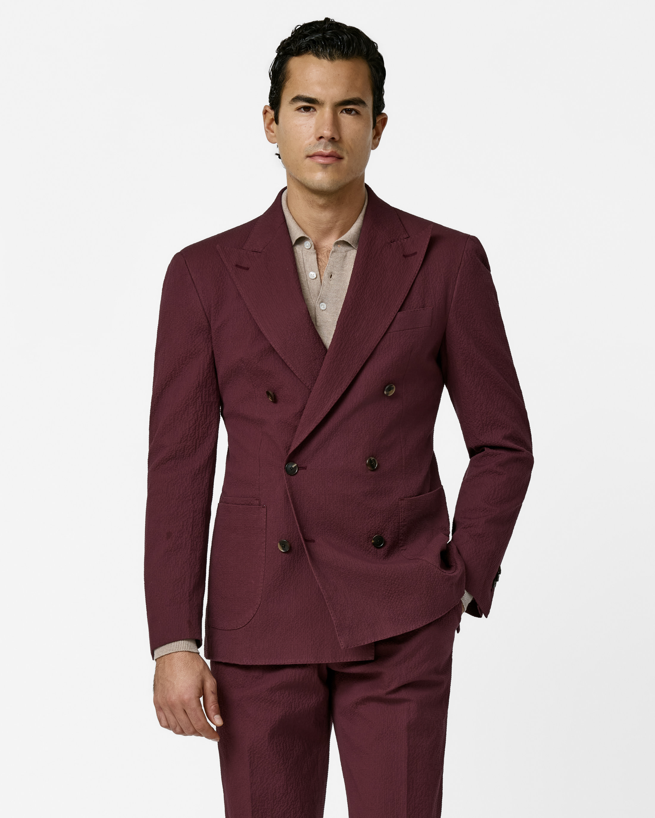 This rich autumn red seersucker suit is a sartorial pick ready for rising temps. Woven in Italy, from a sophisticated stretch cotton blend with a puckered texture for an airy and comfortable fit. Designed here as a double-breasted jacket with straight wide peak lapels. Style it with a summer knit and suede loafers to complete the look.