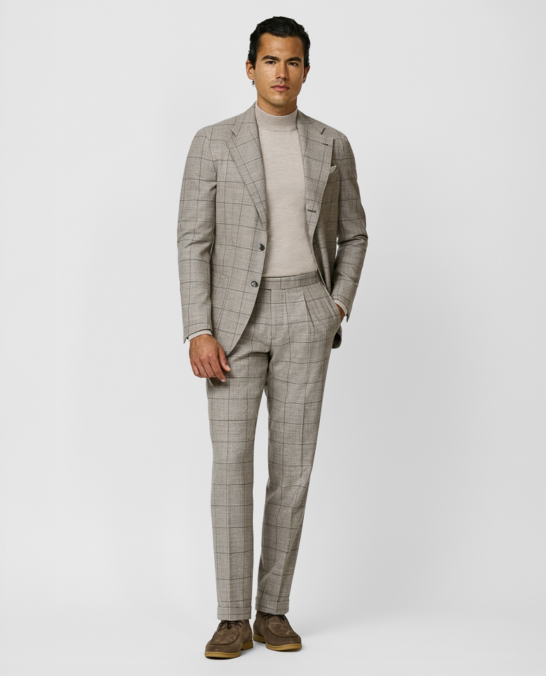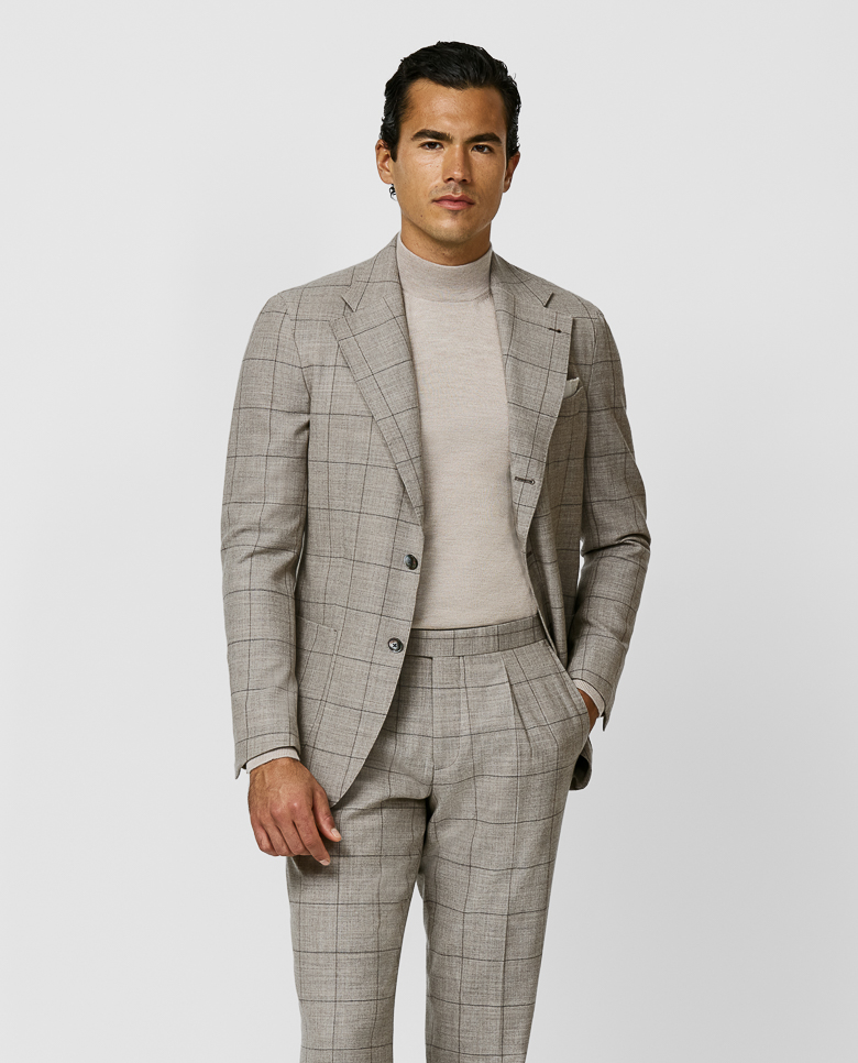 This beige suit with brown windowpane is designed for the modern man – the perfect choice for those seeking both elegance and easy care. Made from breathable S130 wool flannel, it offers natural two-way stretch for all-day comfort and excellent wrinkle resistance. Complete the look with a handstitched pocket square, mock neck knit, and city loafers with laces. Make this suit your own with our many customization options to choose from. S130 wool Flannel Windowpane Natural bi-stretch Breathable