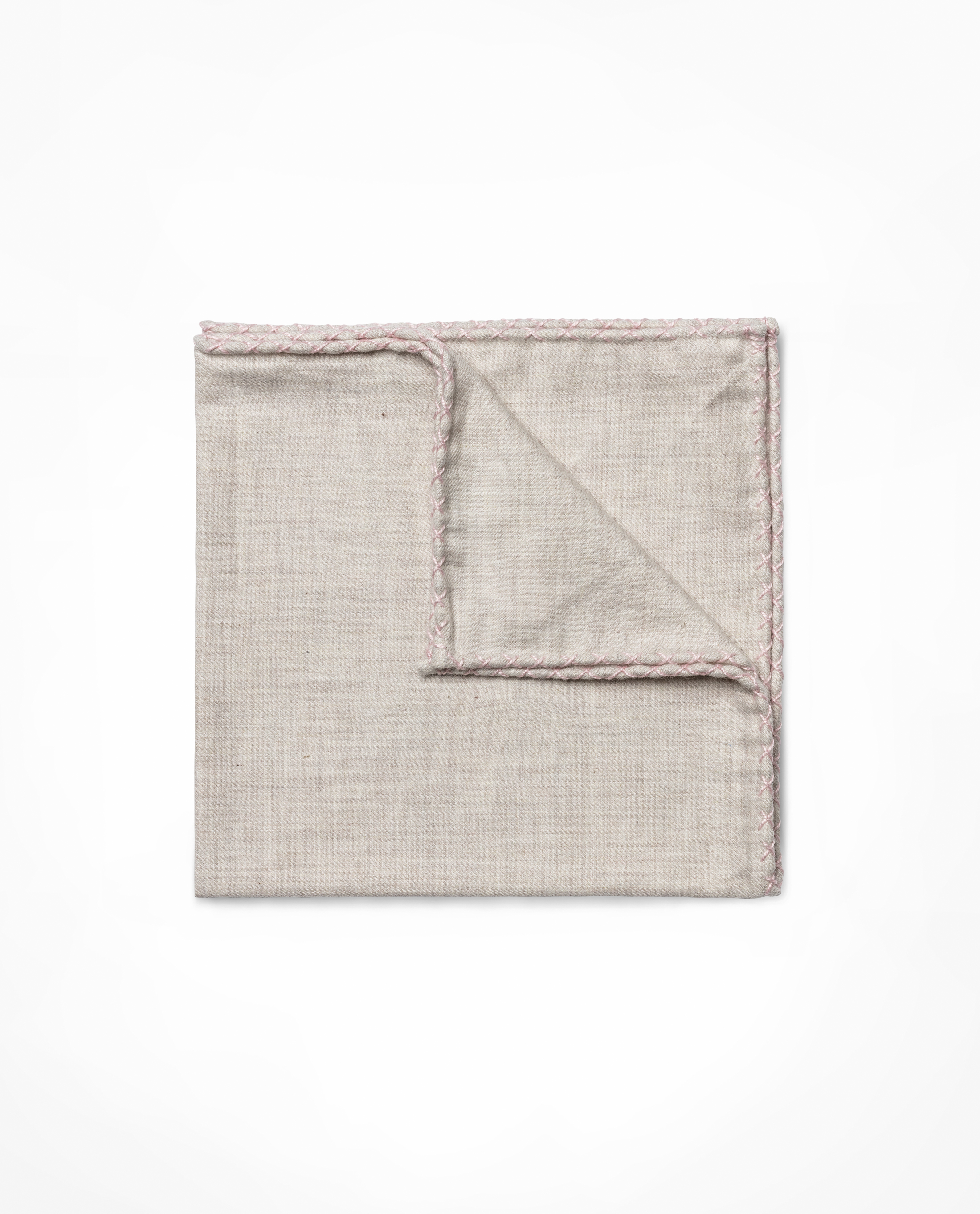 With a flannel finish and neutral tone, this beige pocket square is ideal for your winter styling. Made from naturally strong cotton that is light, airy, and easy to clean. Livened up with handmade cross-stitching around the edge in pale pink. Make this pocket square your own with a monogram. 100% cotton Hand-stitched edge