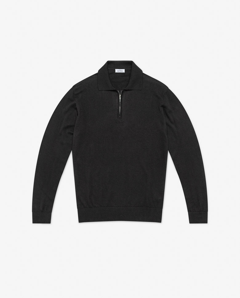 This black knit is summer friendly with a seamless finish. Crafted from a blend of breathable Turkish cotton and soft Inner Mongolian cashmere. Designed here as a polo with a zip, in single yarn for a lightweight look. Make this knitwear your own with our many customization options to choose from.