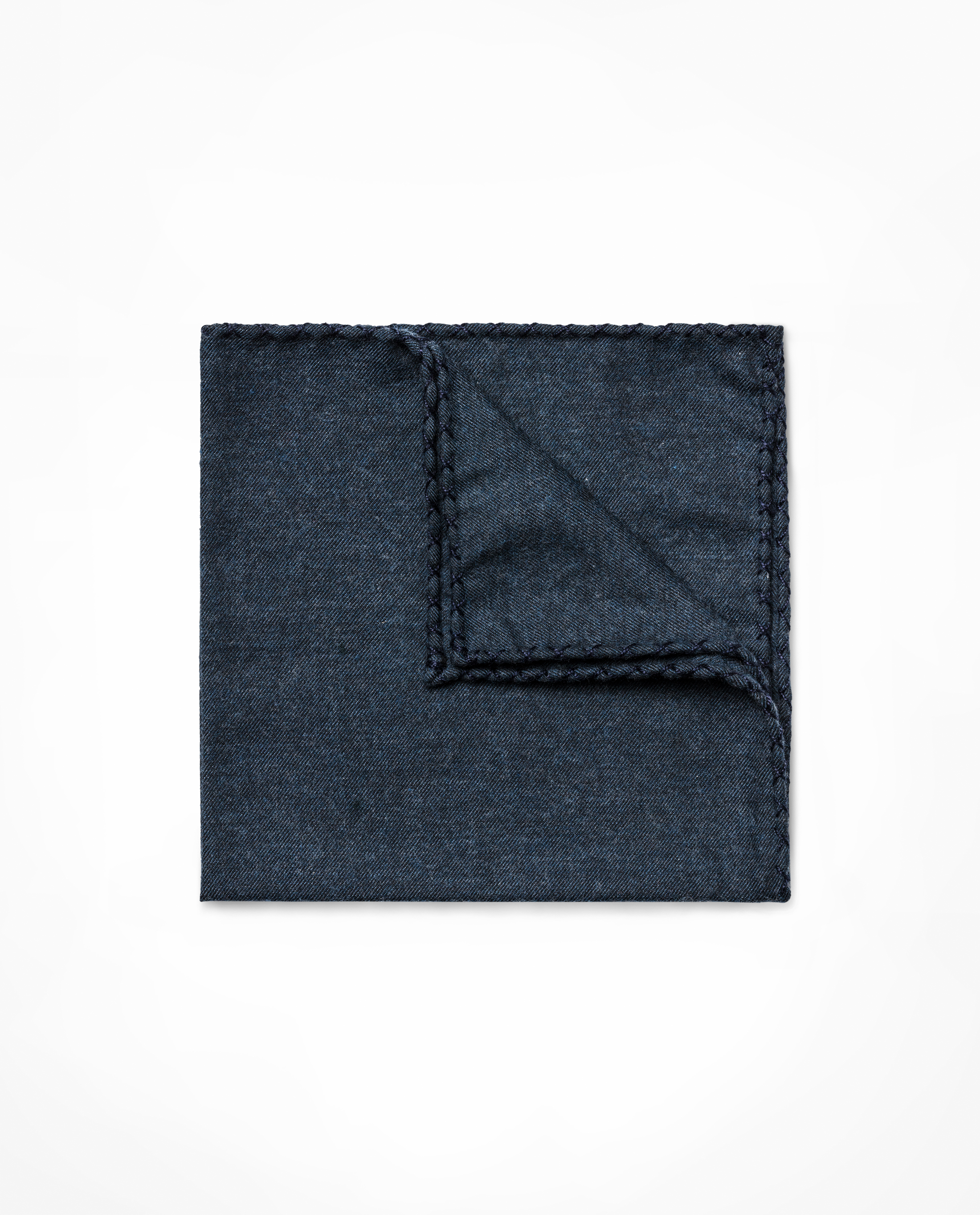 With a flannel finish and timeless hue, this denim blue pocket square is ideal for your winter styling. Made from naturally strong cotton that is light, airy, and easy to clean. Livened up with handmade cross-stitching around the edge in navy. Make this pocket square your own with a monogram. 100% cotton Hand-stitched edge