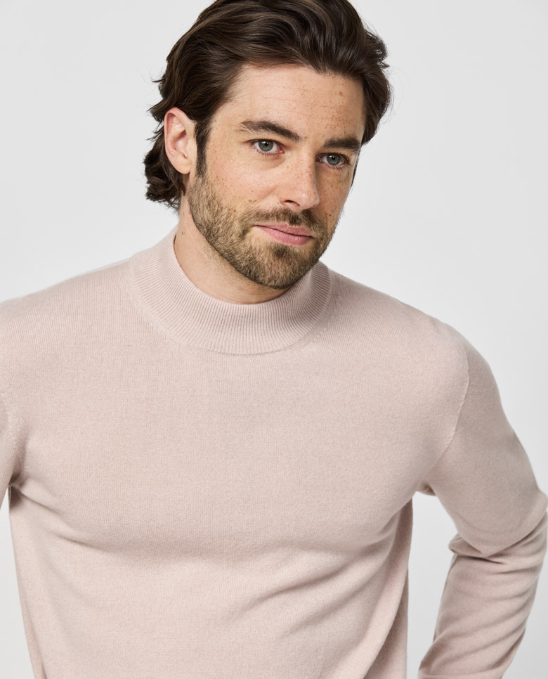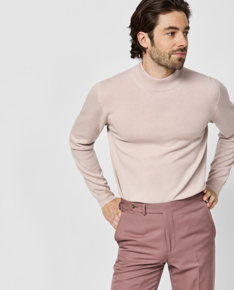A luxurious blush knit with an elevated seamless look. Made from pure cashmere for a soft feel with superior warmth. Designed here with a mock neck, in single yarns for a lighter wear. Make this knitwear your own with our many customization options to choose from. 100% cashmere Lightweight warmth Breathable Soft feel