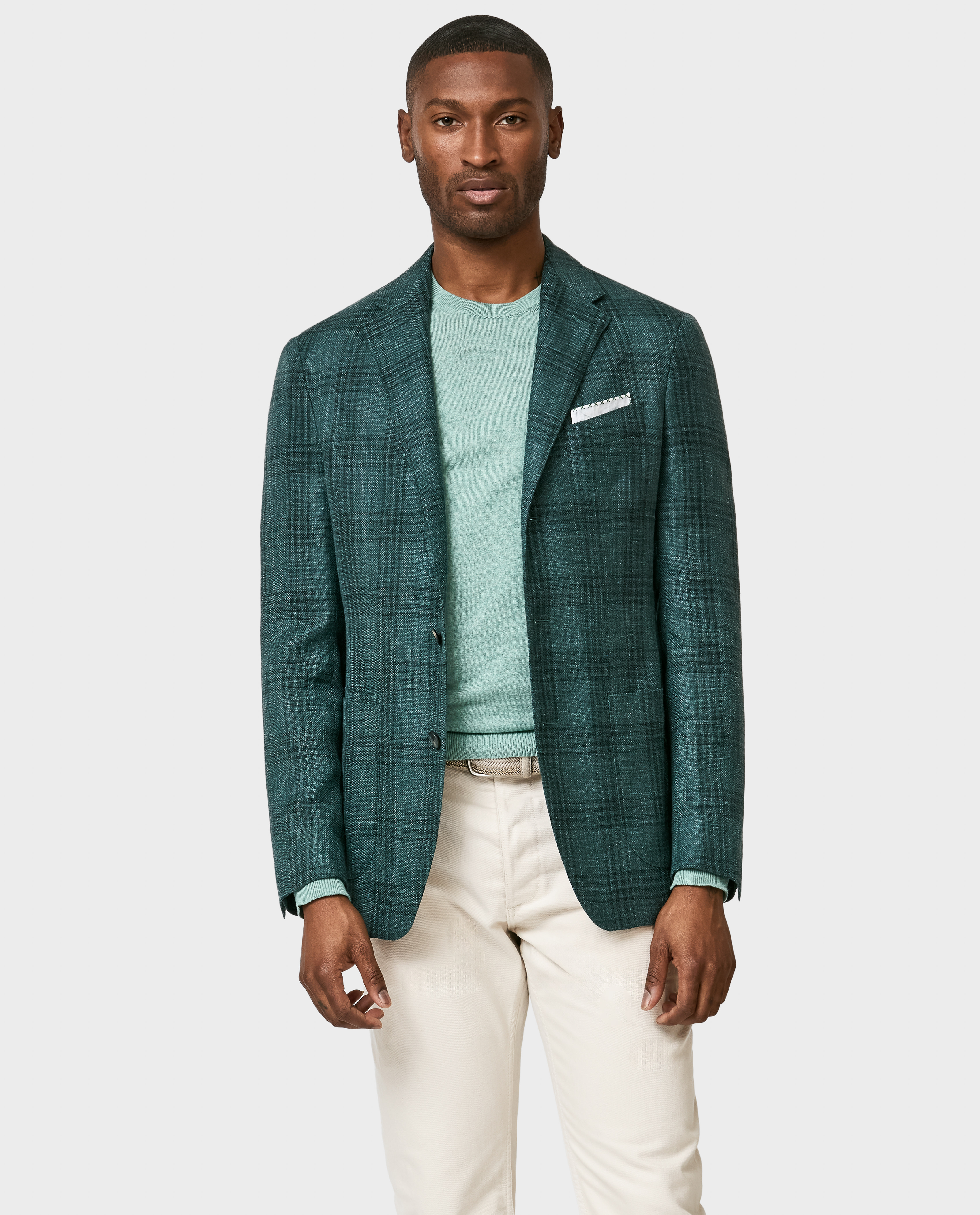 Crafted from an airy wool-silk-linen blend, this bottle green jacket with tonal overcheck combines a versatile four-season weight with the organic texture of linen and refined sheen of silk. Designed here with an elegant 2.5-button closure, low-gorge notch lapels, and modern patch side pockets. Pair it with a knit in light sage green, cotton chinos, and low-top city loafers to create a fresh seasonal look. Prefer a different style? Every piece is made exclusively for you, with your choice of design options. Wool, silk & linen Tonal overcheck Breathable Light four-season weight