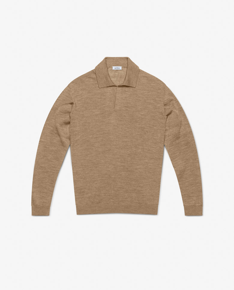 This camel-colored mélange knit is a comfortable addition to your year-round wardrobe. The extra-fine merino wool is 3D knitted for a luxurious seamless look. Designed here as a polo knit without buttons, made from single yarns for a lighter wear. Make this knit your own with our many customization options to choose from.