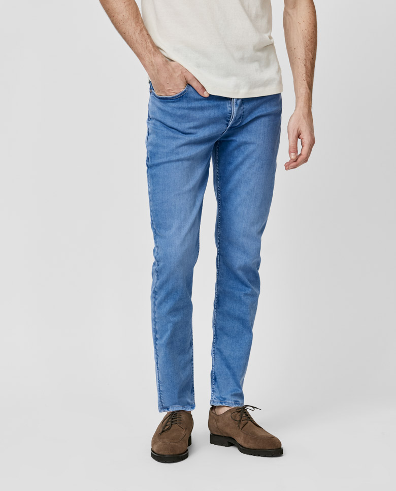 Our most comfortable denim option, these 9oz. vintage blue jeans are super lightweight with superior stretch. Made from a soft cotton blend twill by Candiani that is woven, dyed, and washed in Italy. Designed here with a faded wash. Make these jeans your own with our many customization options to choose from. Super stretch denim Lightweight
