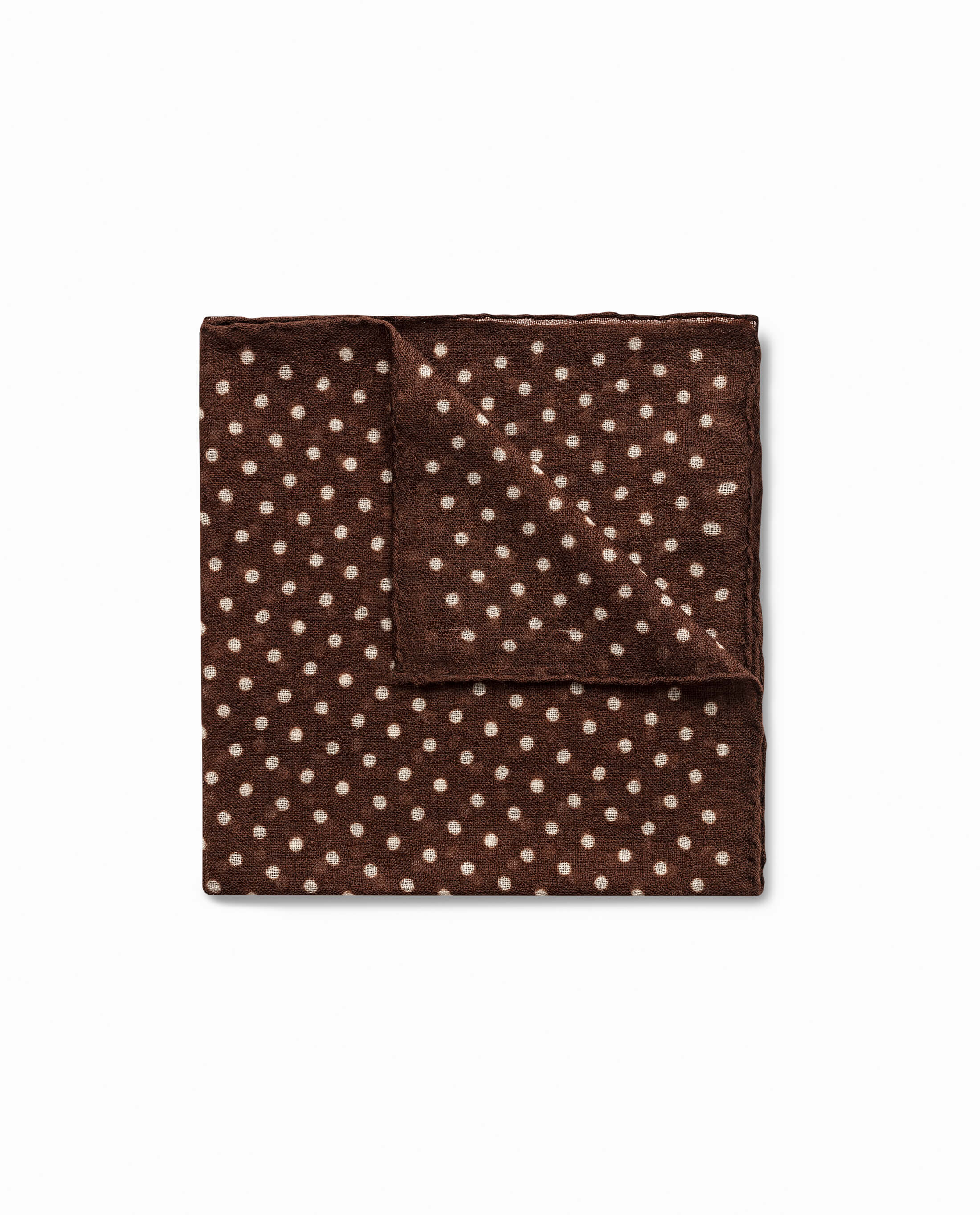 Ghosts of polka dots in white decorate this open wool weave pocket squares. Perfect for adding a sartorial touch to more casual looks. Here in brown.