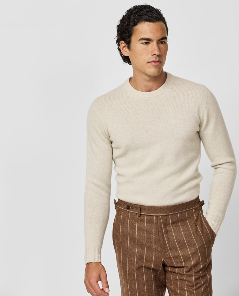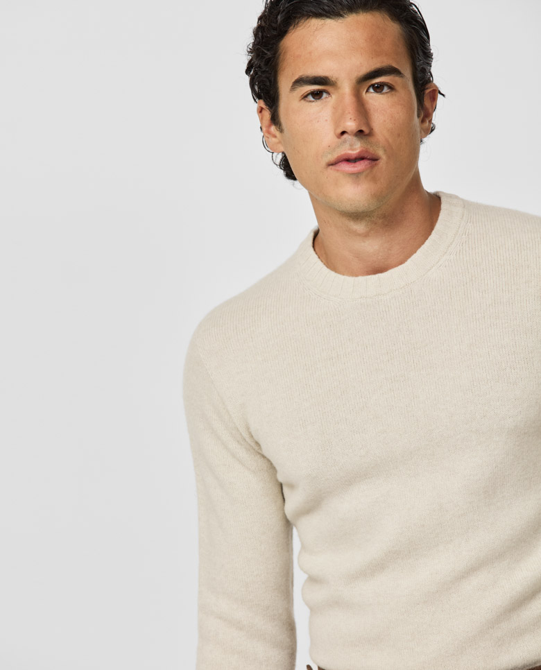 This cream knit is a warm layer you can wear every day. Made from a mix of ultra-fine Australian wool and soft Inner Mongolian cashmere, 3D-knitted for a luxurious seamless look. Designed here as a crew neck with wide ribbed detailing, in double ply for winter warmth. Make this knitwear your own with our many customization options to choose from. Wool & cashmere Warm Soft feel