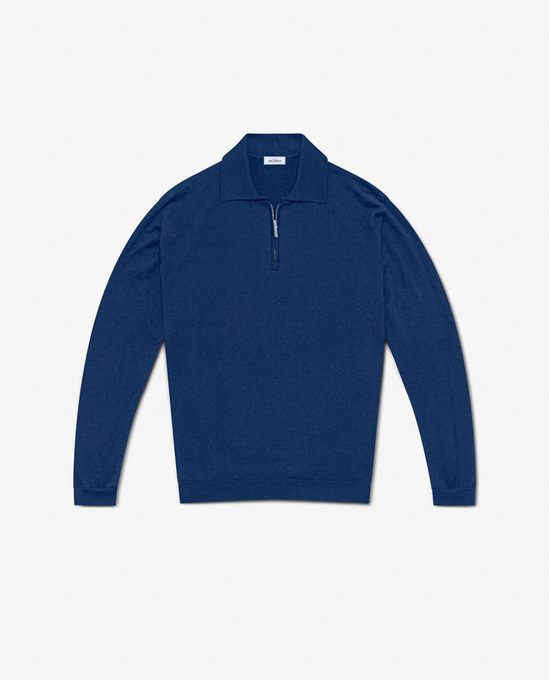 This dark blue knit will keep you cool in summer and warm enough in winter. The high-quality blend combines the drape and shine of silk with luxurious cashmere. Crafted on 3D-knitting machines for a sophisticated seamless look. Designed here as a polo with a zip, in single ply for a lighter wear. Make this knitwear your own with our customization options.