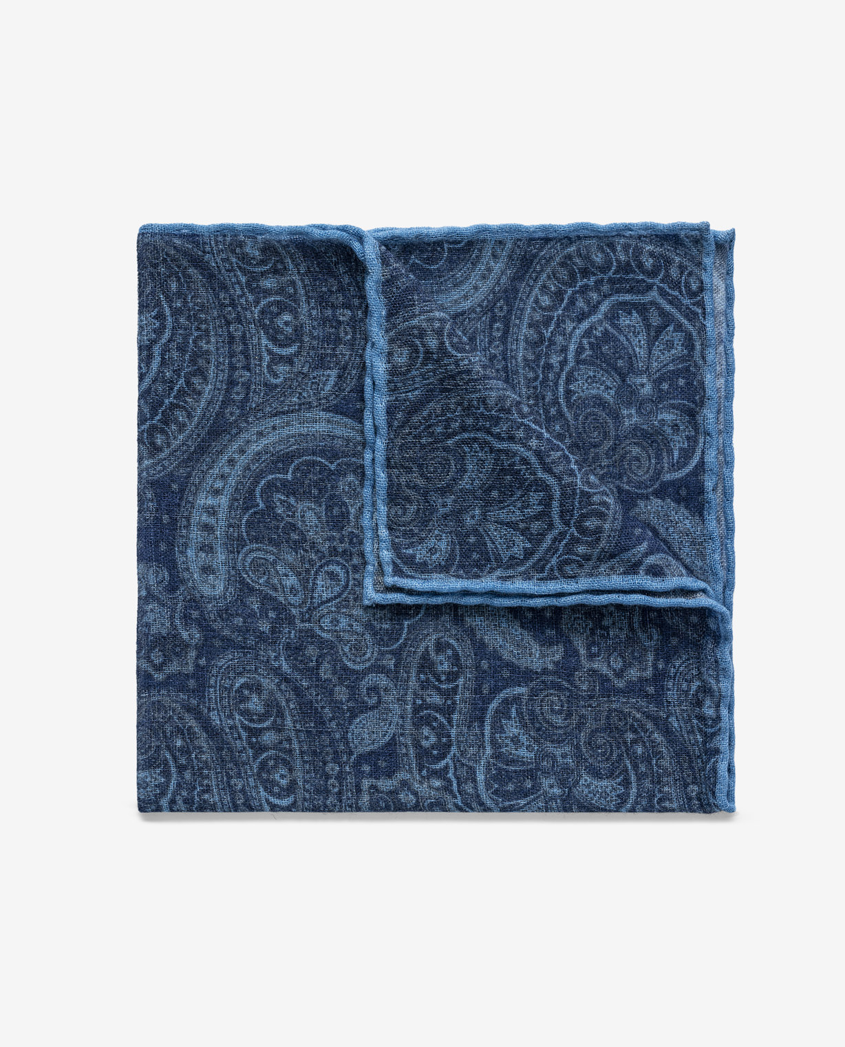 With an artistic paisley in muted blues, this pocket square offers a refined addition to any look. Crafted from an open weave of wool with silk for a softened finish. Designed here with a hand-rolled edge for added elegance. Make this pocket square your own with a monogram.