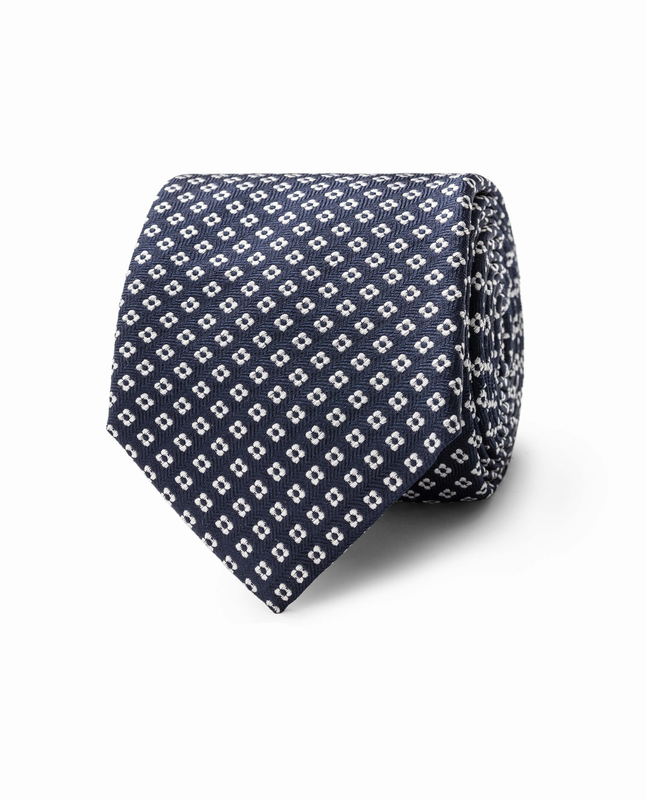 Make a statement with this handmade tie in dark blue featuring a micro-flower design. The herringbone silk jacquard weave is refined and resistant to creasing. Designed here with a tipped construction in a 7cm width. Make this tie your own with our range of design and personalization options.