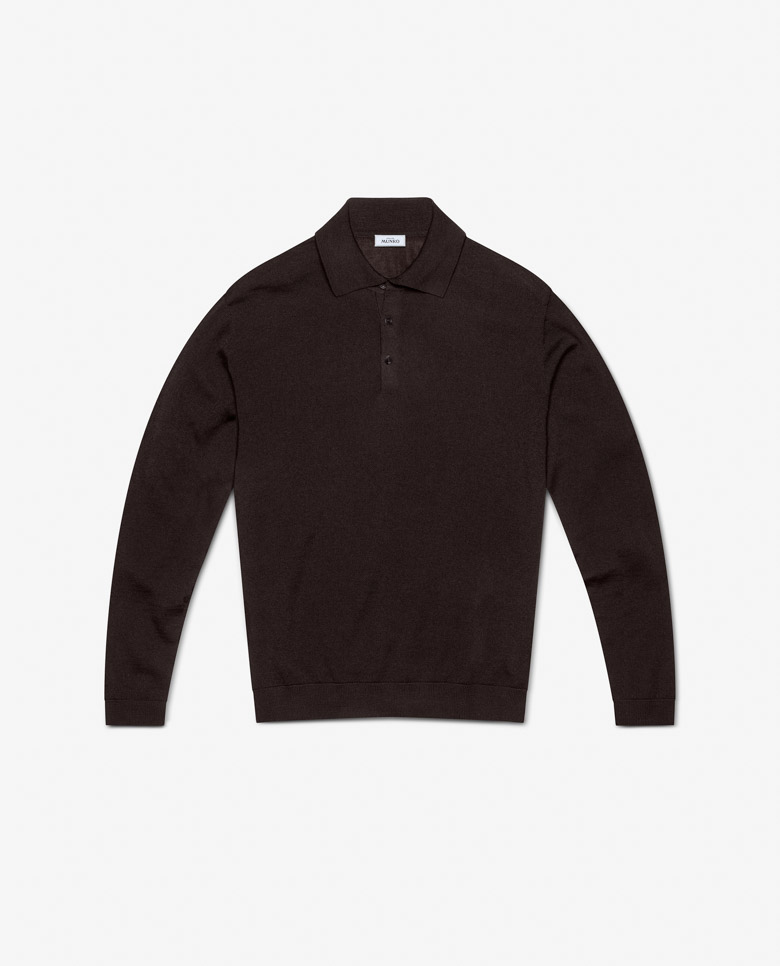 This dark brown knit is a comfortable addition to your year-round wardrobe. The extra-fine merino wool is 3D knitted for a luxurious seamless look. Designed here with a polo collar, made from single yarns for a lighter wear. Make this knit your own with our many customization options to choose from.