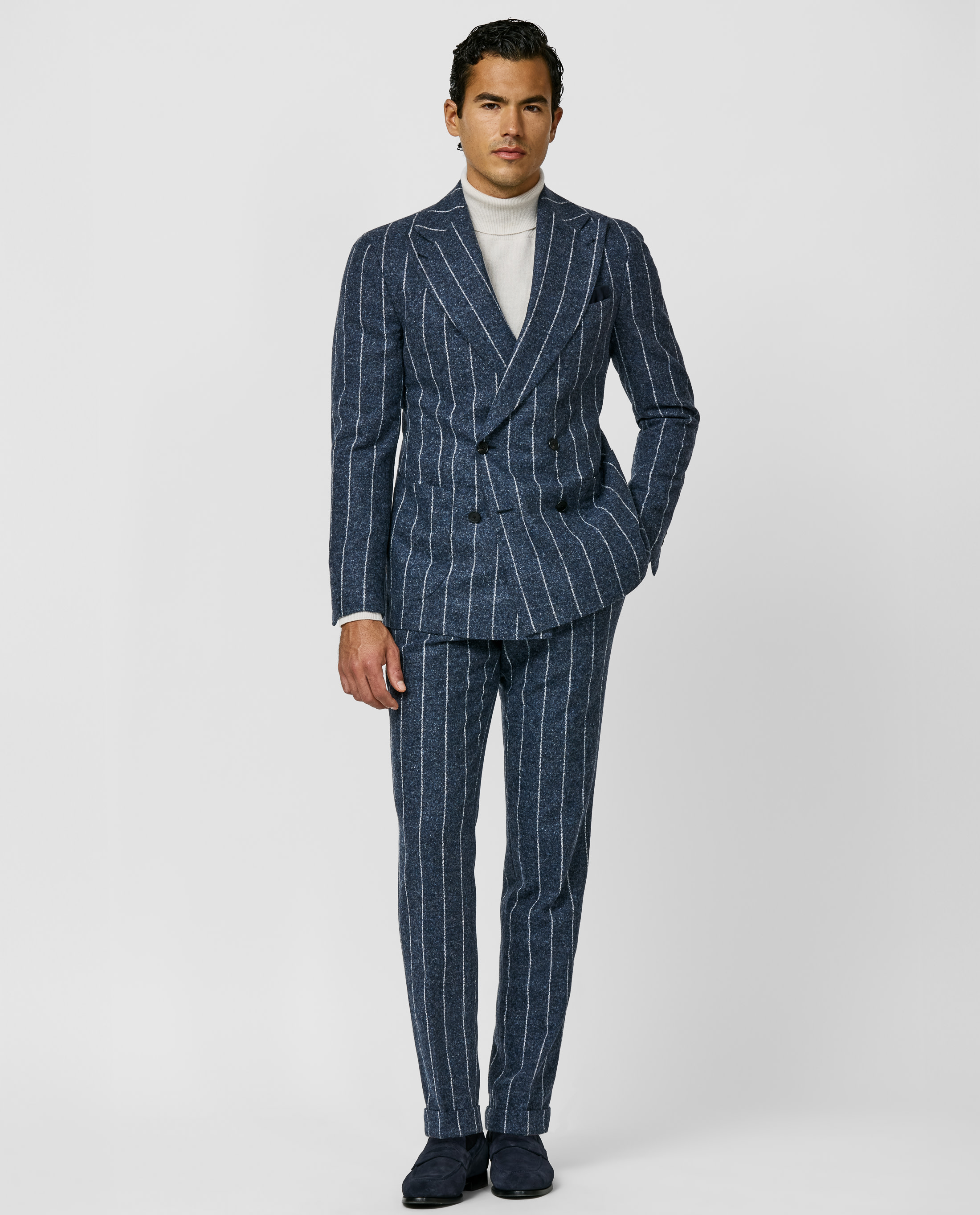 This dark blue suit with ice gray stripes crafted from a stretch alpaca-wool blend balances comfort and sophistication. The baby alpaca's natural properties provide lasting durability and performance, keeping the fabric lightweight yet high-performing. This two-piece suit features a double-breasted four-button jacket, four kissing buttons with an open cuff, and a Neapolitan lapel buttonhole. Complete the look with a silk pocket square, cashmere turtle neck, and suede penny loafers for an effortlessly elegant style. Make this suit your own with our many customization options to choose from. Soft feel Hypoallergenic Breathable Versatile Stripe