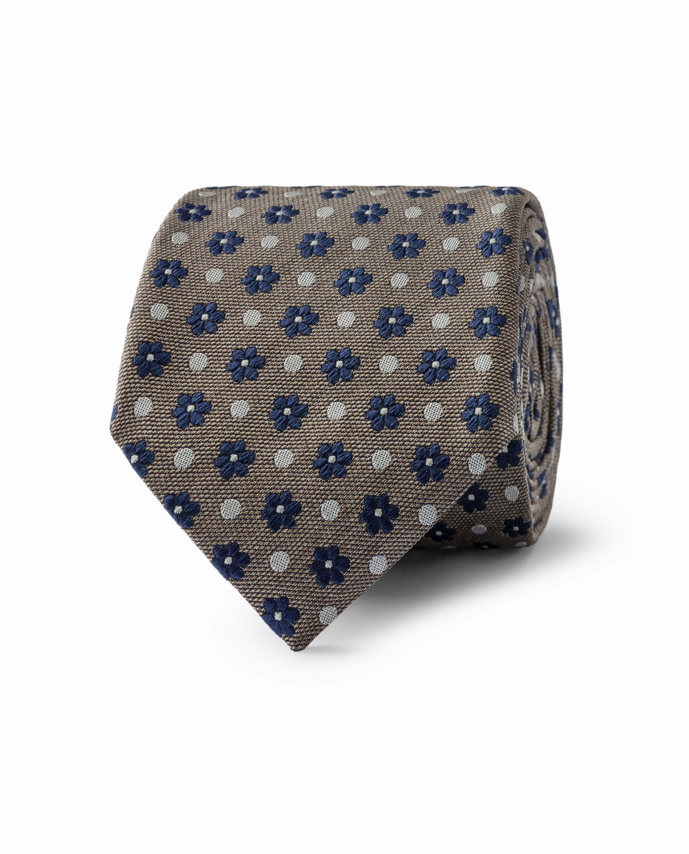 Upgrade your look with this lustrous silk tie woven with a floral and dot jacquard pattern. Here in a dark hue of taupe with navy flowers, it's versatile enough to take you through a host of occasions in contemporary flair.