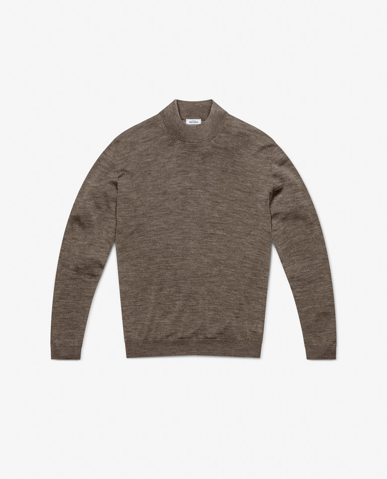 This dark taupe mélange knit is a comfortable addition to your year-round wardrobe. The extra-fine merino wool is 3D knitted for a luxurious seamless look. Designed here as a mock neck, made from single yarns for a lighter wear. Make this knit your own with our many customization options to choose from.