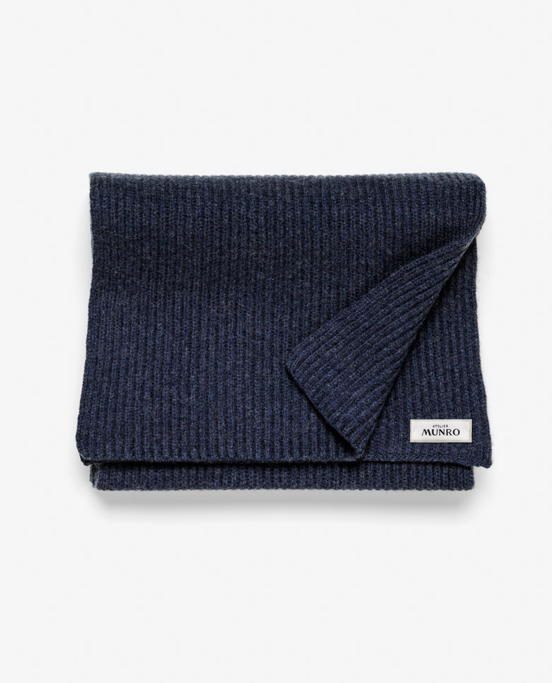 Wrap yourself up for winter with this denim blue ribbed scarf. Made from a high-quality blend of 90% Australian wool and 10% Inner Mongolian cashmere. The mix of ultra-fine wool with soft cashmere offers warmth you can wear every day.