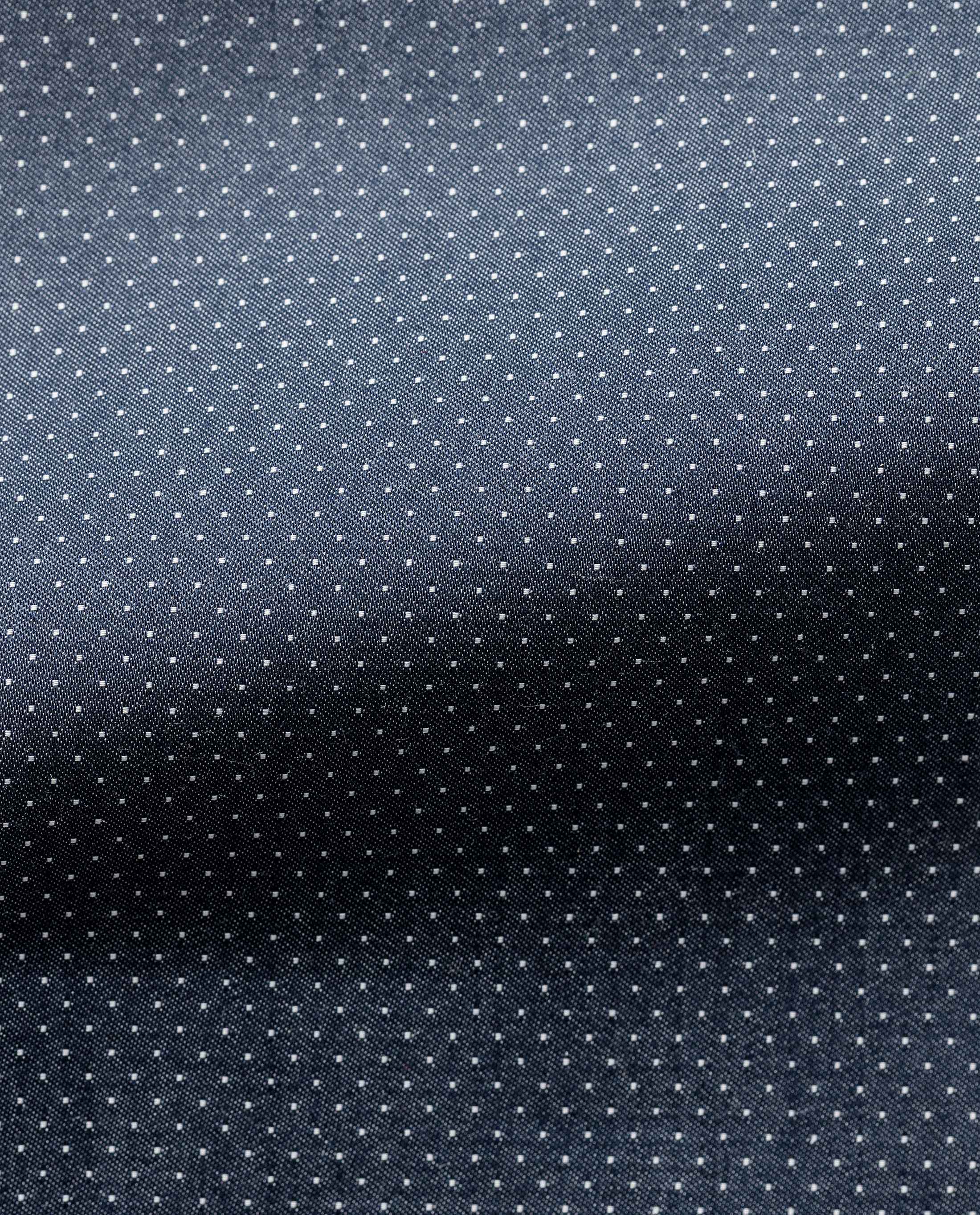 A seasonal shirting with a denim look in a blue dobbby with white micro polka dots.
