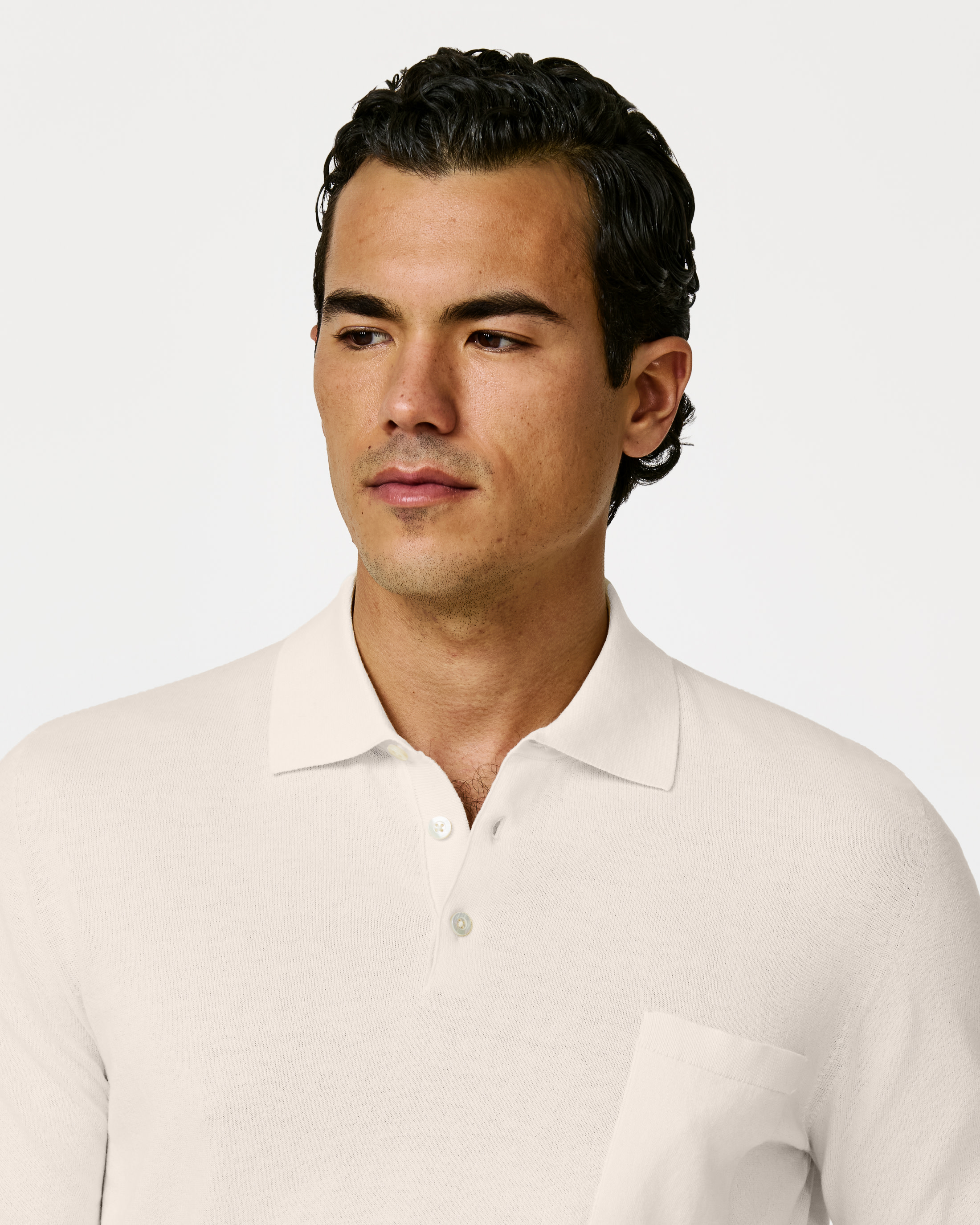 Cool to the touch with matte elegance, this seamless ecru knit is an easy summertime essential. The Pima cotton sourced from the USA is ultra-fine with longer fibers for remarkable smoothness, durability, and crease resistance. Designed here as a short-sleeved polo in single-ply yarn for a classic look.