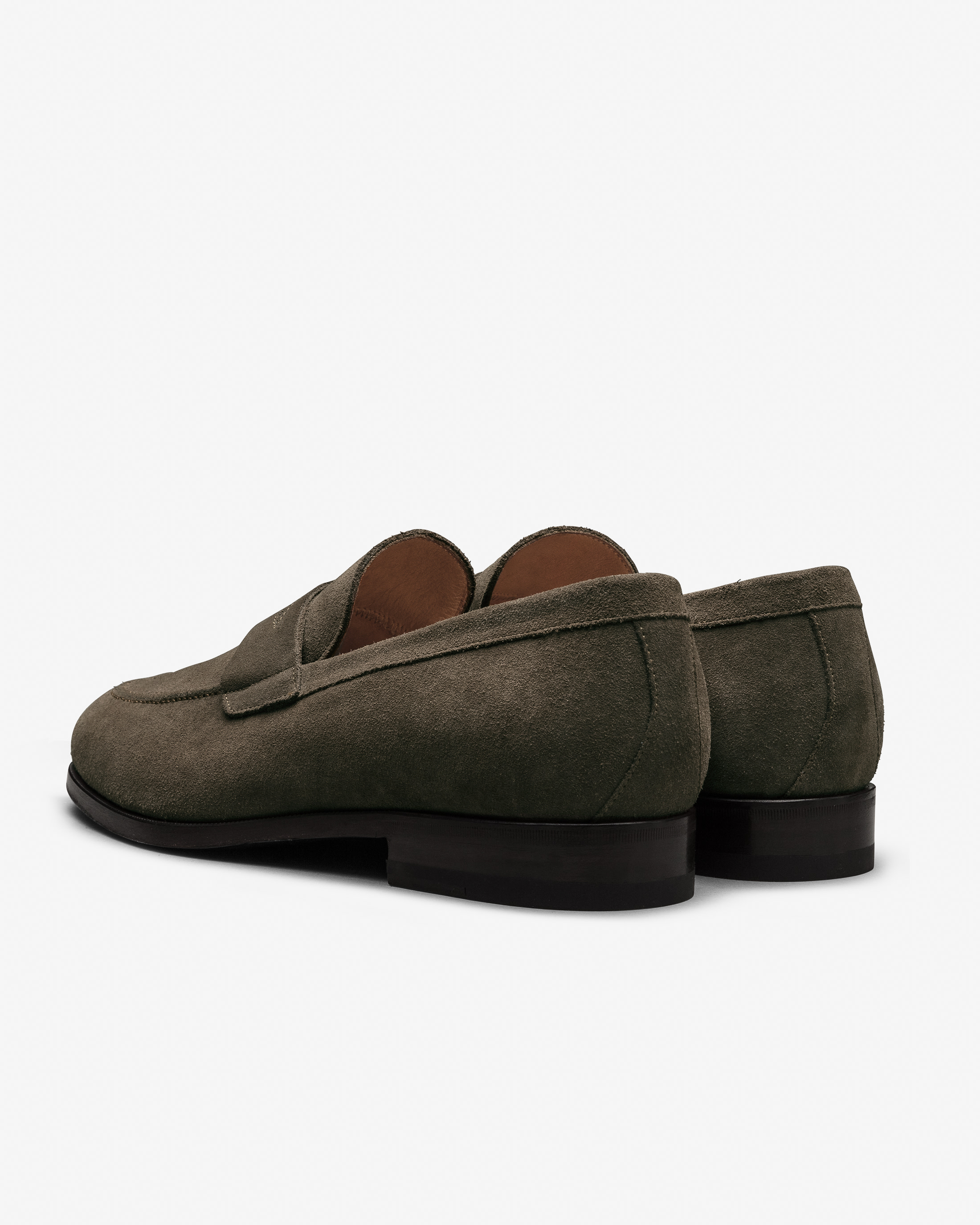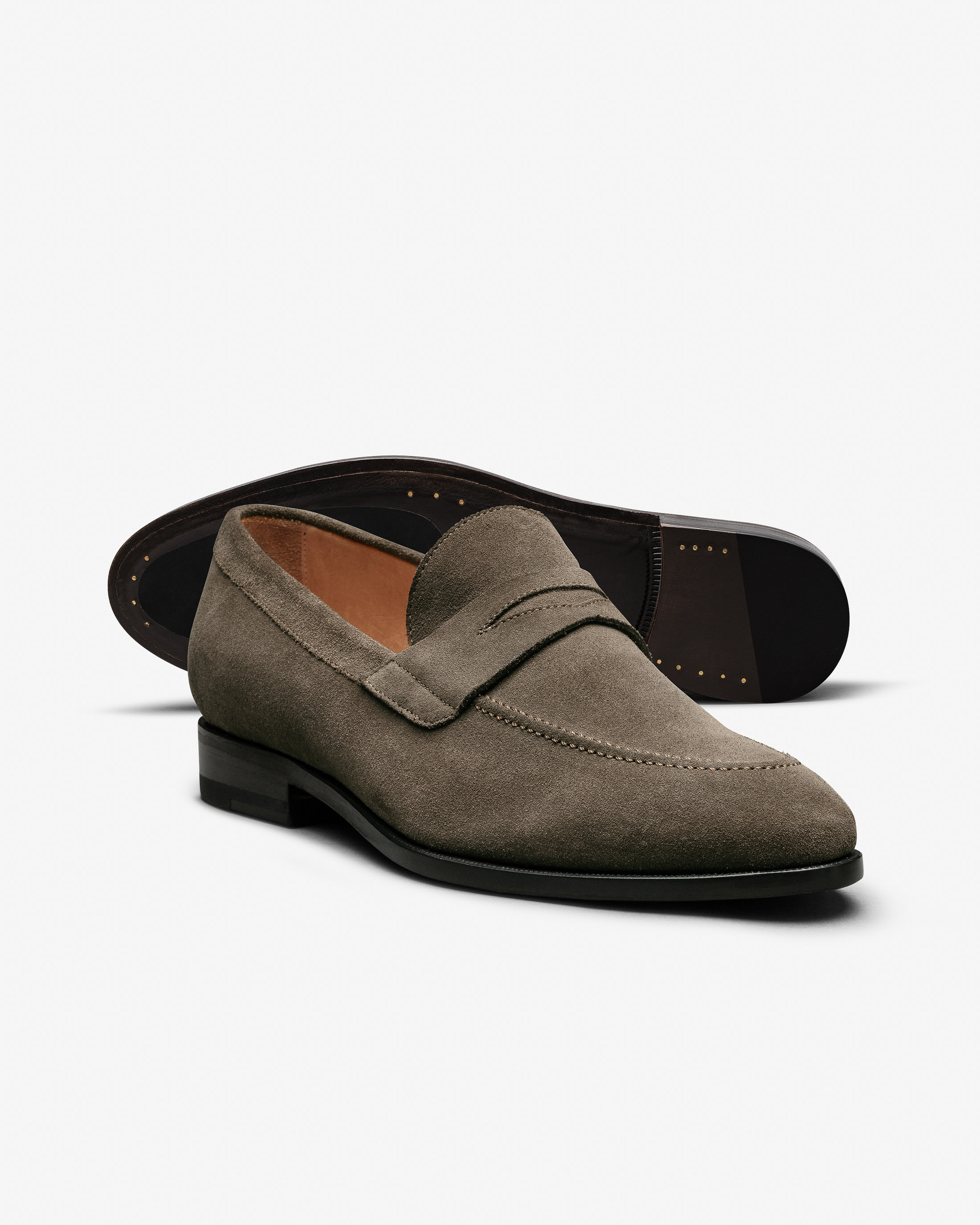 Add casual luxury to your look with these taupe suede shoes. Handmade from chrome-tanned suede calfskin leather with soft napping for a rich touch. Featuring a water-resistant finish to withstand the wetter months of the year. Designed here as penny loafers.
