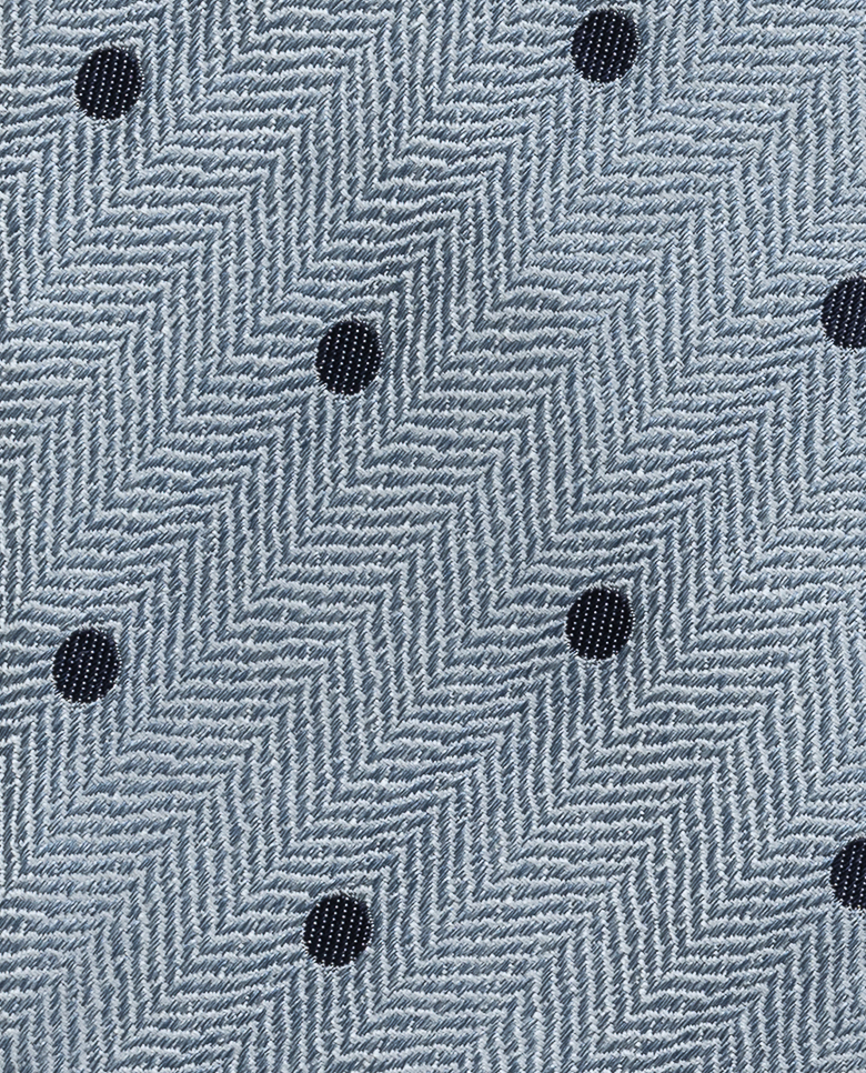 This ice blue and white silk tie features a textured herringbone and dark blue dots, blending refined elegance with a touch of playfulness. Ideal for weddings and formal events, it offers a fresh, modernly sophisticated look for those who value style. Make this tie your own with our many customization options to choose from. 100% silk Luxurious texture Jacquard Elegant drape Shine Herringbone