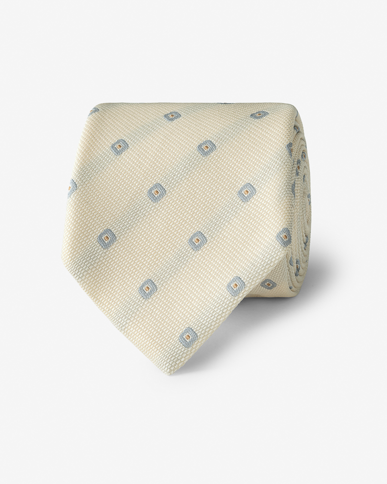 This ivory tie features a light blue and cognac square design for a look that blends traditional charm with contemporary style. Woven on a jacquard loom from cotton and silk for a more structured drape with a hint of shine. Ideal for formal and professional settings. Make this tie your own with our range of design and personalization options. Handmade Cotton & silk Jacquard Luxurious texture Subtle sheen