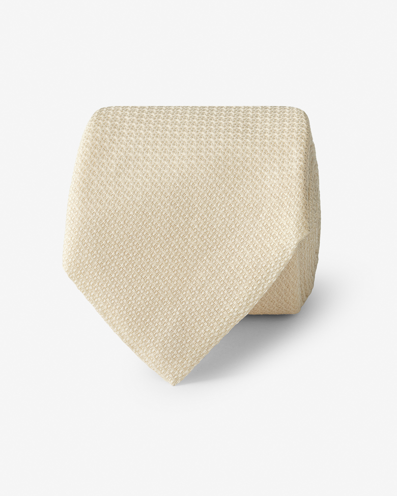 This ivory-hued tie embodies the quiet luxury of artisanal craft. Defined by lightness, the open-weave of cotton and silk showcases understated craftsmanship and subtle texture. Minimal yet distinguished, it's an ideal choice for summer weddings and warm-weather occasions. Make this tie your own with our range of design and personalization options. Handmade Cotton & silk Open weave Textured Soft feel