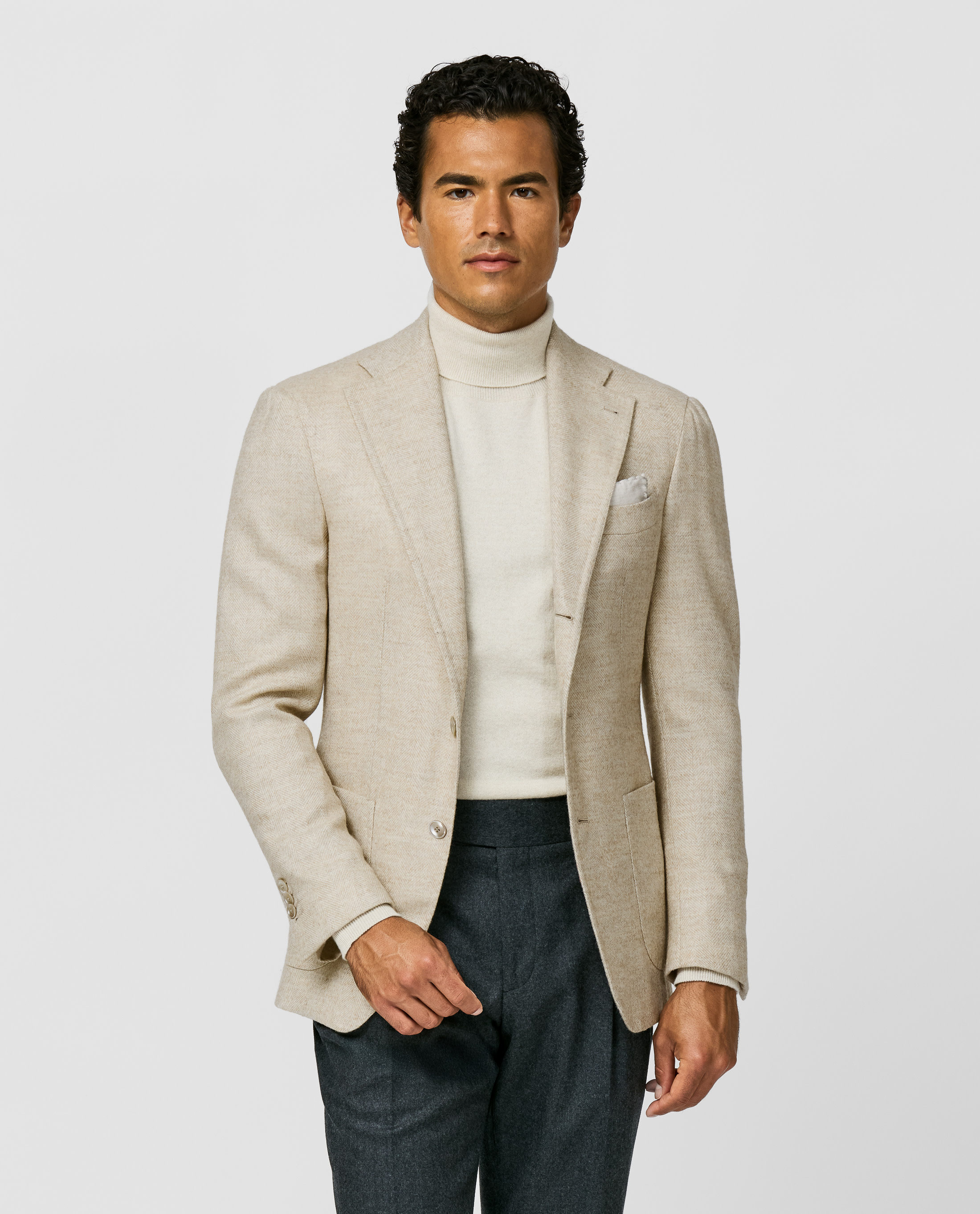 Bring luxury to a traditionally casual pattern with this ivory herringbone jacket. Crafted from a rare blend of baby alpaca and 2-ply flamed wool yarns with a slightly brushed finish for extra texture and volume. Style it with a cream turtle neck and brown suede shoes to complete the look. Make this jacket your own with our many customization options.