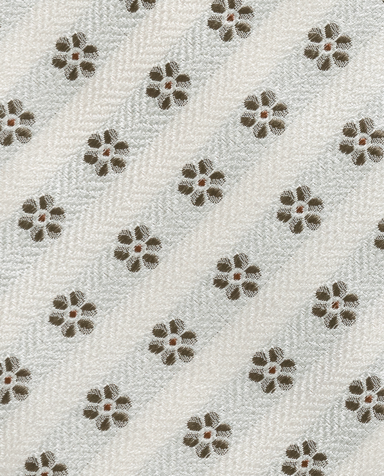 This ivory silk tie features a textured herringbone and taupe structured flowers, blending refined elegance with a touch of playfulness. Ideal for weddings and formal events, it offers a fresh, modernly sophisticated look for those who value style. Make this tie your own with our many customization options to choose from. 100% silk Luxurious texture Jacquard Elegant drape Shine Herringbone flower design