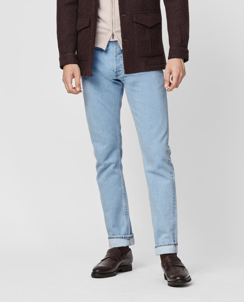 These light blue jeans are dyed and crafted by the famous Candiani mill. Made from 3x1 selvedge twill denim woven on original vintage shuttle looms and washed in the heart of Veneto to create a sophisticated, worn-in look. Dyed with all-natural indigo dyes–here in a gray cast. Make these jeans your own with our many customization options to choose from. 100% cotton Selvedge rigid Washed Worn-in look