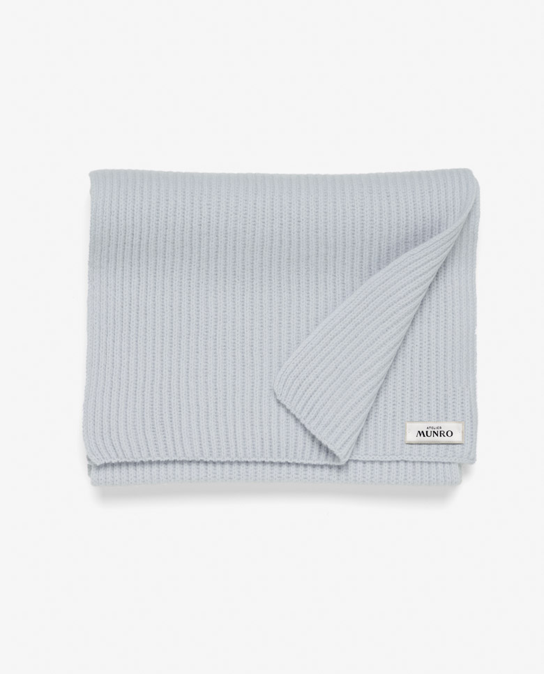 Wrap yourself up for winter with this light blue ribbed scarf. Made from a high-quality blend of 90% Australian wool and 10% Inner Mongolian cashmere. The mix of ultra-fine wool with soft cashmere offers warmth you can wear every day.