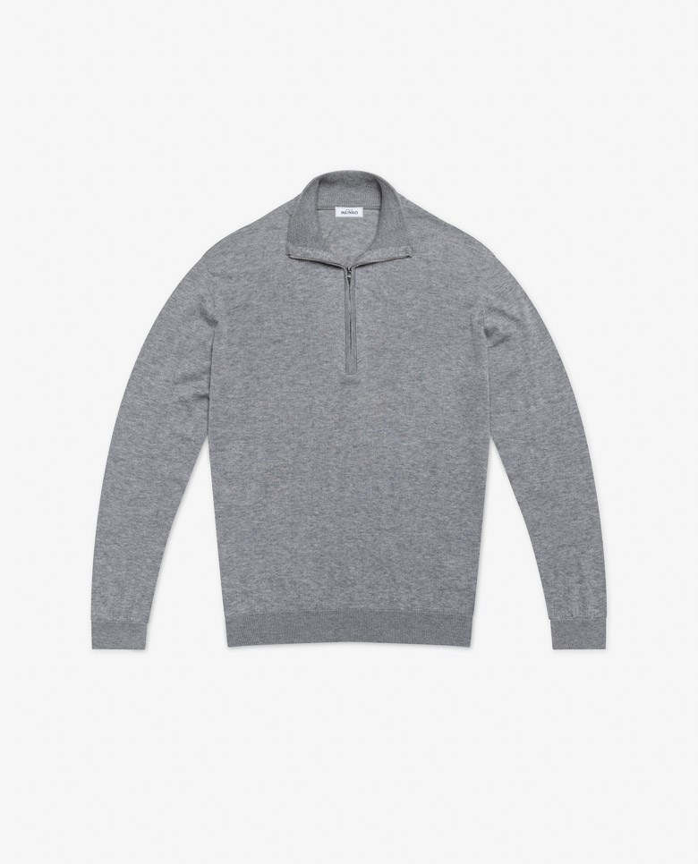 This light gray knit is summer friendly with a seamless finish. Crafted from a blend of breathable Turkish cotton and soft Inner Mongolian cashmere. Designed here with a half-length zip, in single yarn for a lightweight look. Make this knitwear your own with our many customization options to choose from.