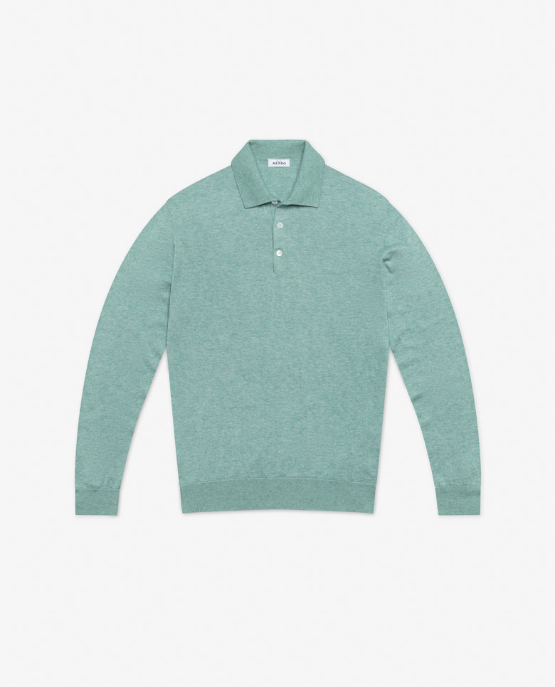This light sage green knit is summer friendly with a seamless finish. Crafted from a blend of breathable Turkish cotton and soft Inner Mongolian cashmere. Designed here as a classic polo, in single yarn for a lightweight look. Make this knitwear your own with our many customization options to choose from. Cotton & cashmere Breathable Soft feel