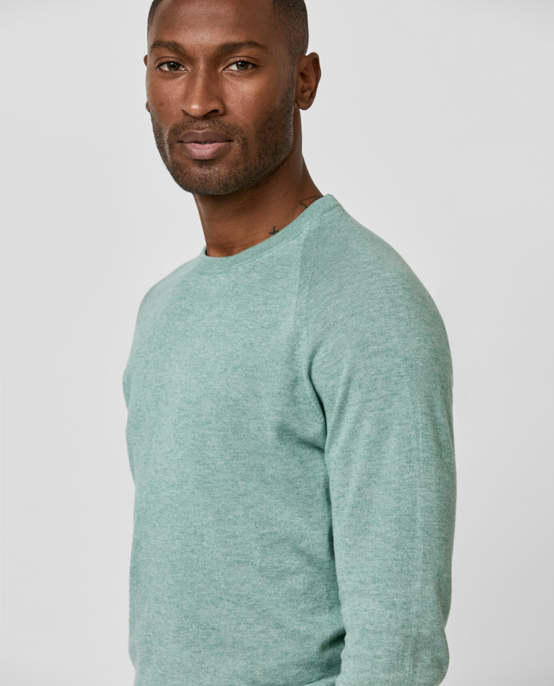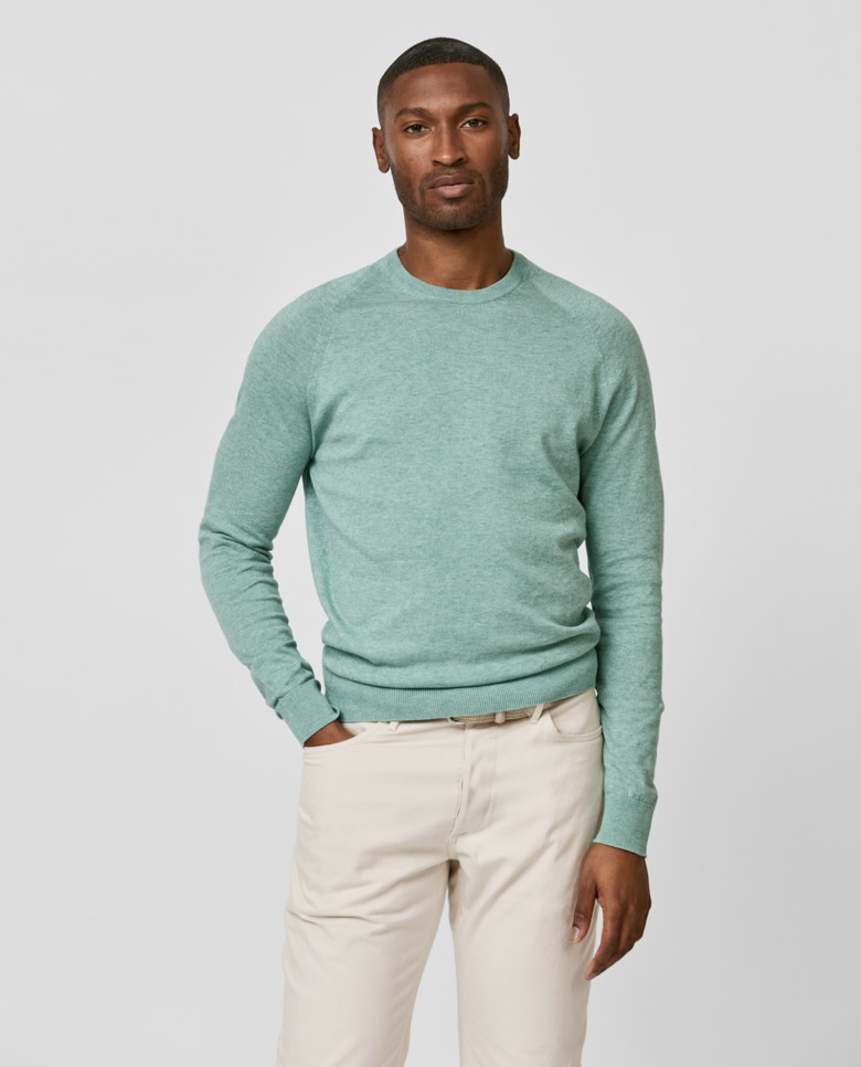 This light sage green knit is summer friendly with a seamless finish. Crafted from a blend of breathable Turkish cotton and soft Inner Mongolian cashmere. Designed here with a slim crew neck, in single ply for a lightweight look. Make this knitwear your own with our many customization options to choose from. Cotton & cashmere Breathable Soft feel