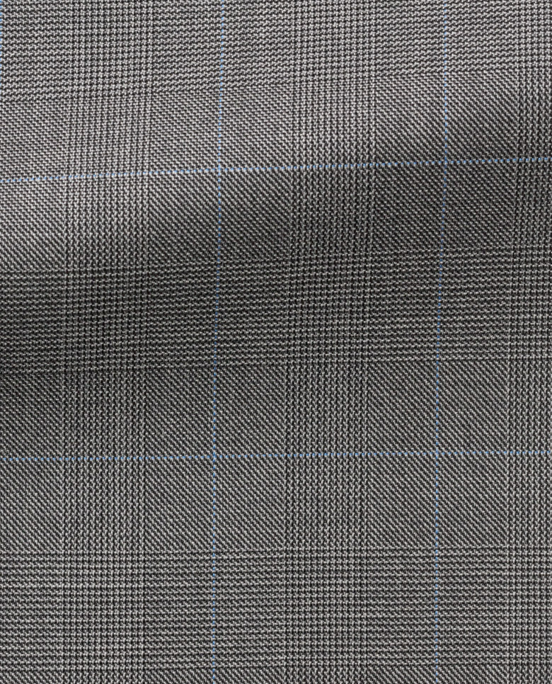 A versatile medium gray Glen plaid with light blue windowpane made from 100% wool. Featuring a four-season weight and a smooth, crisp feel.