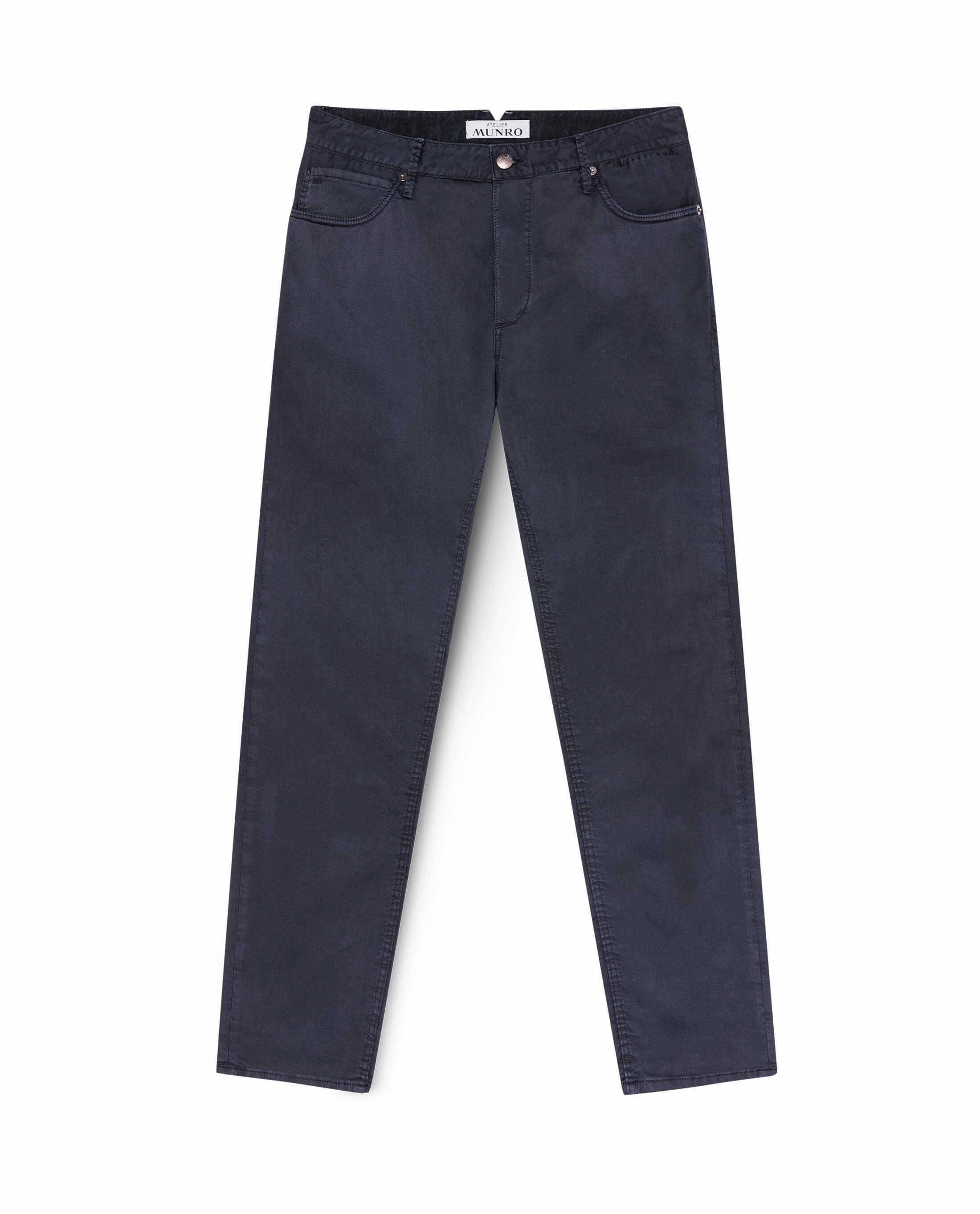 Olimpias created this stretch fine twill in the industrial heartland of Italy. The left-hand twill leaves your pair feeling softer with each wash. This exclusive pair is dyed as a whole, resulting in a slightly washed color variation along the seams and extra color in the lining. A navy variation suitable for informal and formal occasions.