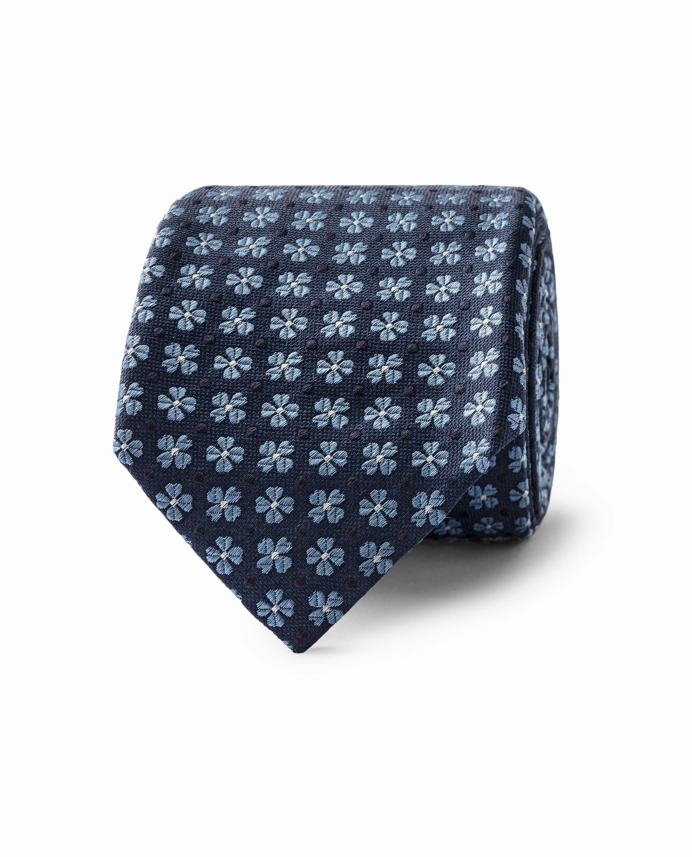 This pure silk midnight blue tie features an elegant gloss thanks to the jacquard weave. A match made in heaven, bringing a rich and refined touch to your looks. Further elevated with a light and contemporary floral design among fine tonal dots, adding just the right amount of flair.